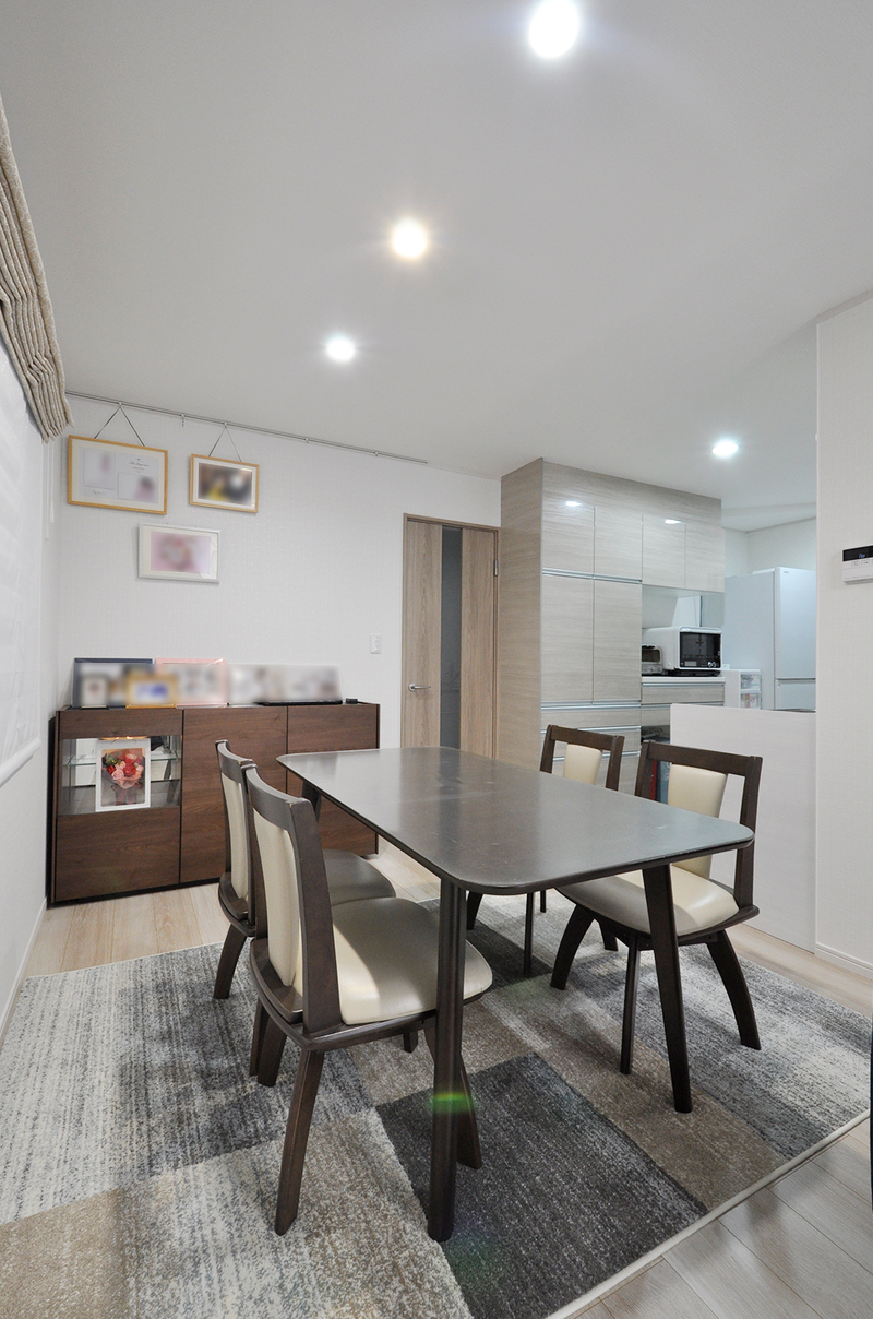 床材(Panasonic/ベリティスフロアーS)と建具(Panasonic/ベリティス)を変え、明るい雰囲気に生まれ変わったリビングダイニング。写真をたくさん飾れるようにピクチャーレールも取付けています。
