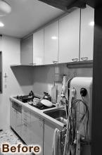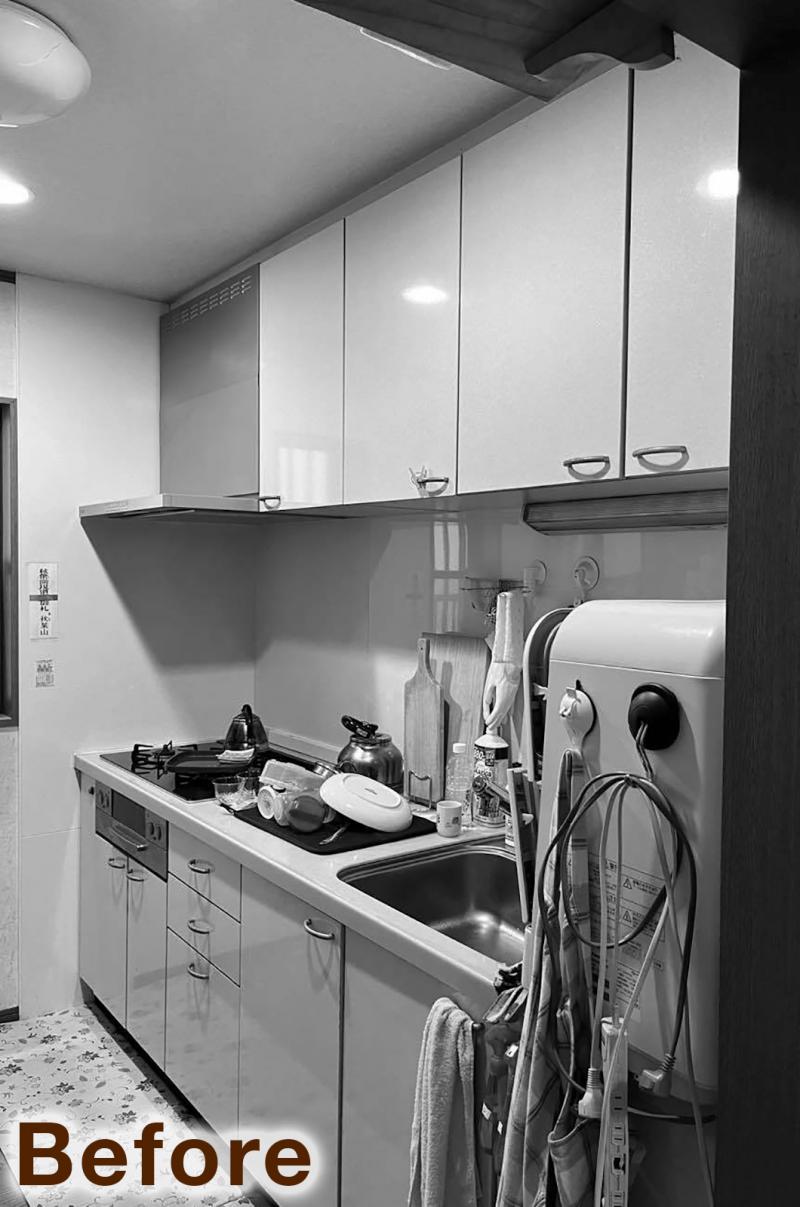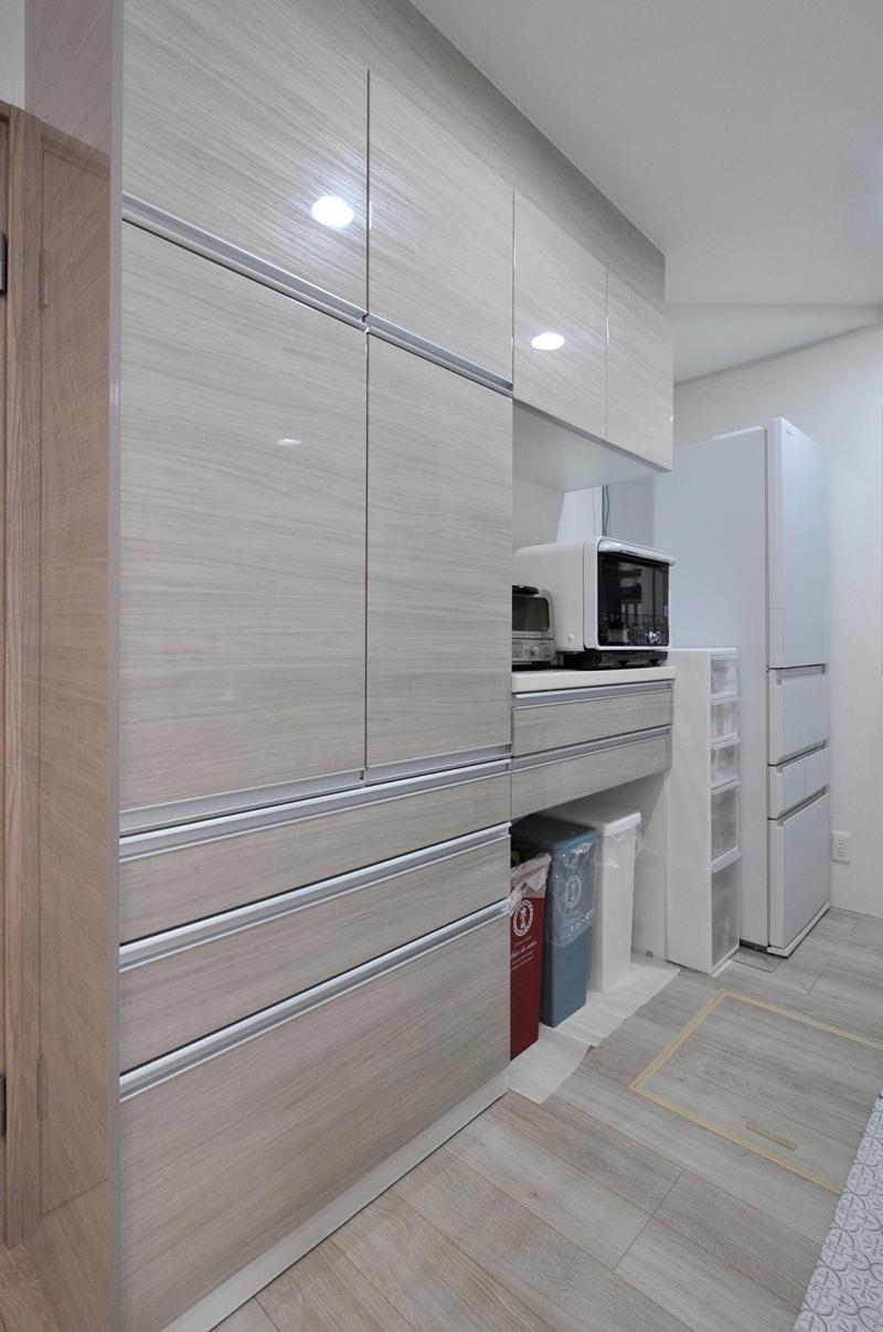 袖壁があり独立した部屋になっていたキッチンは、袖壁を撤去してリビングダイニングとつなげ、吊戸もなくすことでスタイリッシュで開放的な空間に。飾り棚スペースやピクチャーレールを取付け、お孫さんの写真などをたくさん飾れるようにしています。