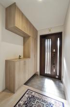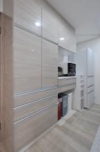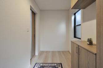 玄関扉は高級感のある縦格子デザインのLIXIL/リシェント G14型(色:クリエモカ)に取り替え。玄関収納(Panasonic/ベリティス コンポリア)は床色や建具に合わせてグレージュアッシュ柄に。収納力のあるトールキャビネットと、圧迫感を抑えたローユニットを組み合わせています。