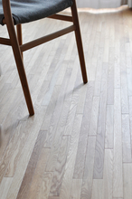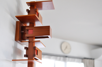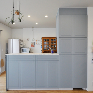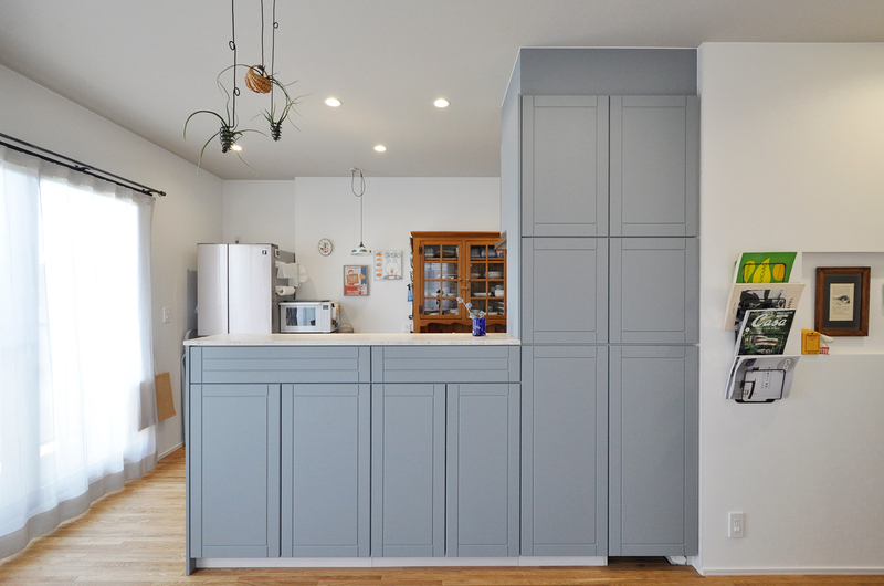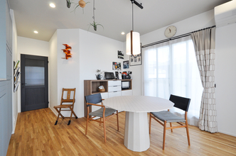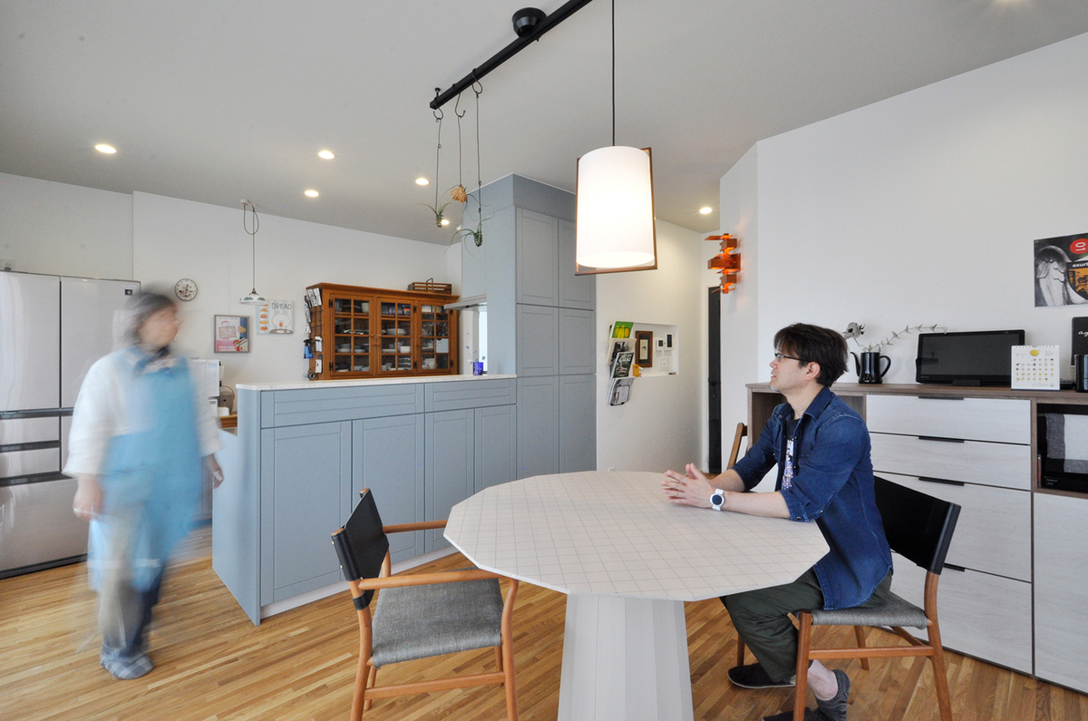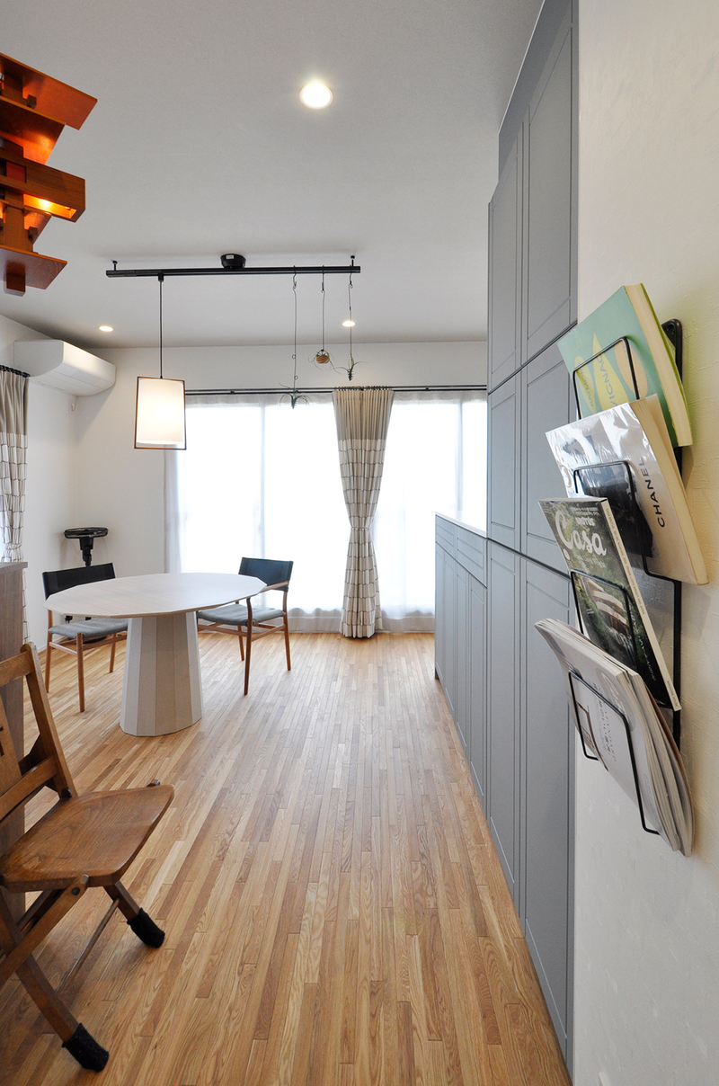カリモクニュースタンダードのテーブルやフランクロイドライトのブラケット照明など、お気に入りの家具や小物たちでまとめられたダイニングキッチン。無垢フローリングは経年変化が楽しめるマルホン/ヨーロピアンオーク(35mm)。収納は造り付けPanasonic/キュビオス。用途に合わせて組み合わせ自由です。