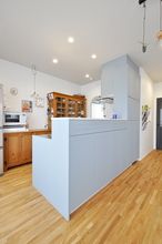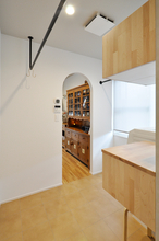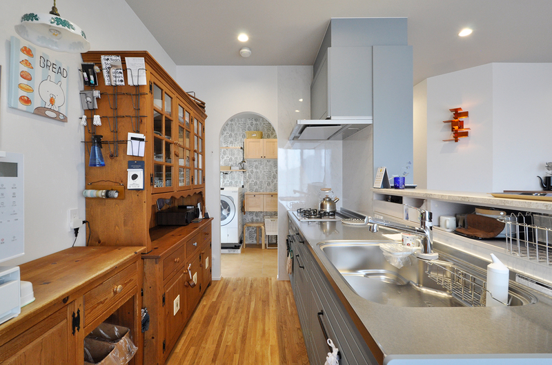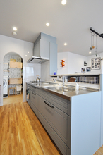 システムキッチン(クリナップ/ステディア、W=2550)はダイニング側に食器や小物などが格納できる収納一体型を採用。一体型なので壁の厚みが必要なくスペースを有効活用できます。アール開口を奥に抜けるとランドリールームや洗面室とつながります。