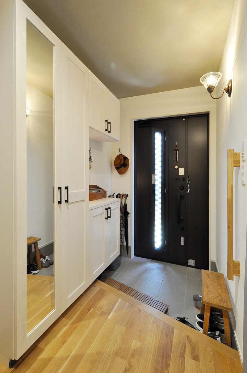住んでいたマンションの老朽化と、親の高齢化のタイミングが重なったことで、実家に戻り、親と二世帯で暮らすことを計画していたH様。完全分離型の二世帯住宅とするため外階段の新設も検討していましたが、増築となるため確認書類や付帯する工事が多岐にわたるなど、ハードルが高くなっていました。この課題に対して、1階部分に子世帯用の玄関を新設し、既存の内階段を活用して2階へと上がっていけるように間取りを変更。増築をすることなく、完全分離型の二世帯住宅が叶いました。