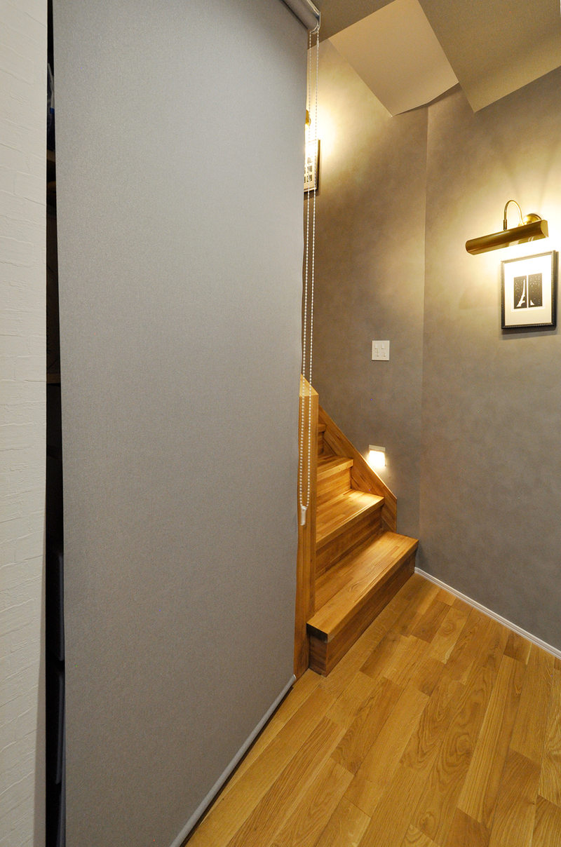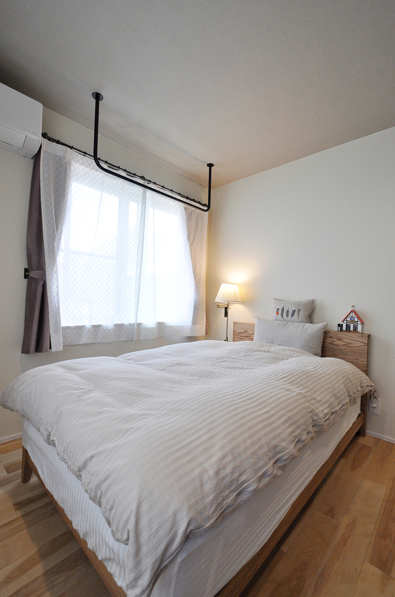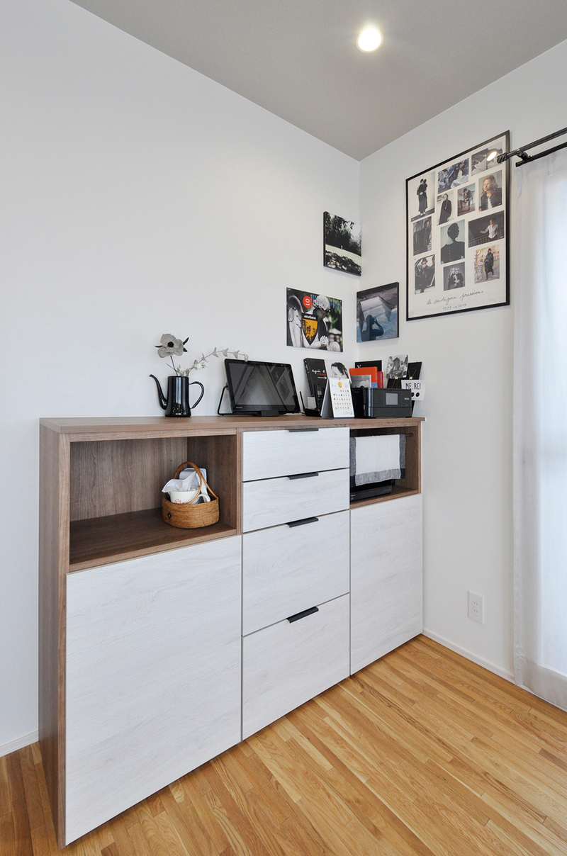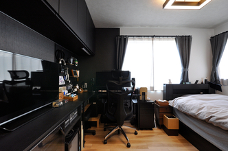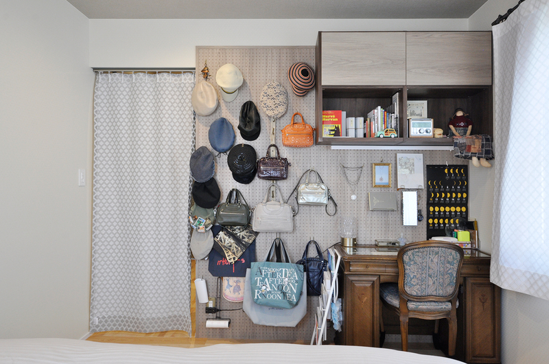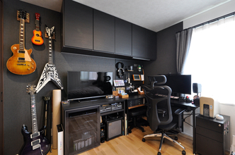 ブラックでまとめられたご主人のお部屋は、ギターを弾いても音漏れしない防音室仕様。グレーベージュを基調としたお部屋は奥様の居室。大切な衣服が収納されているウォークインクローゼットを必ず通る動線に設計です。各々のデスク前には有孔ボードを設置。ご主人はヘッドホンや時計を、奥様は帽子やカバンなどフックを付けて思い思いに飾り付けを楽しまれています。