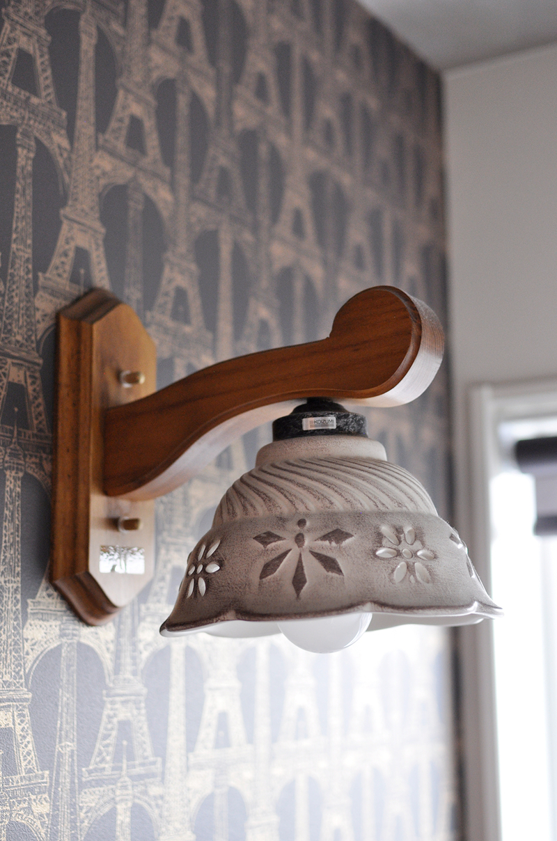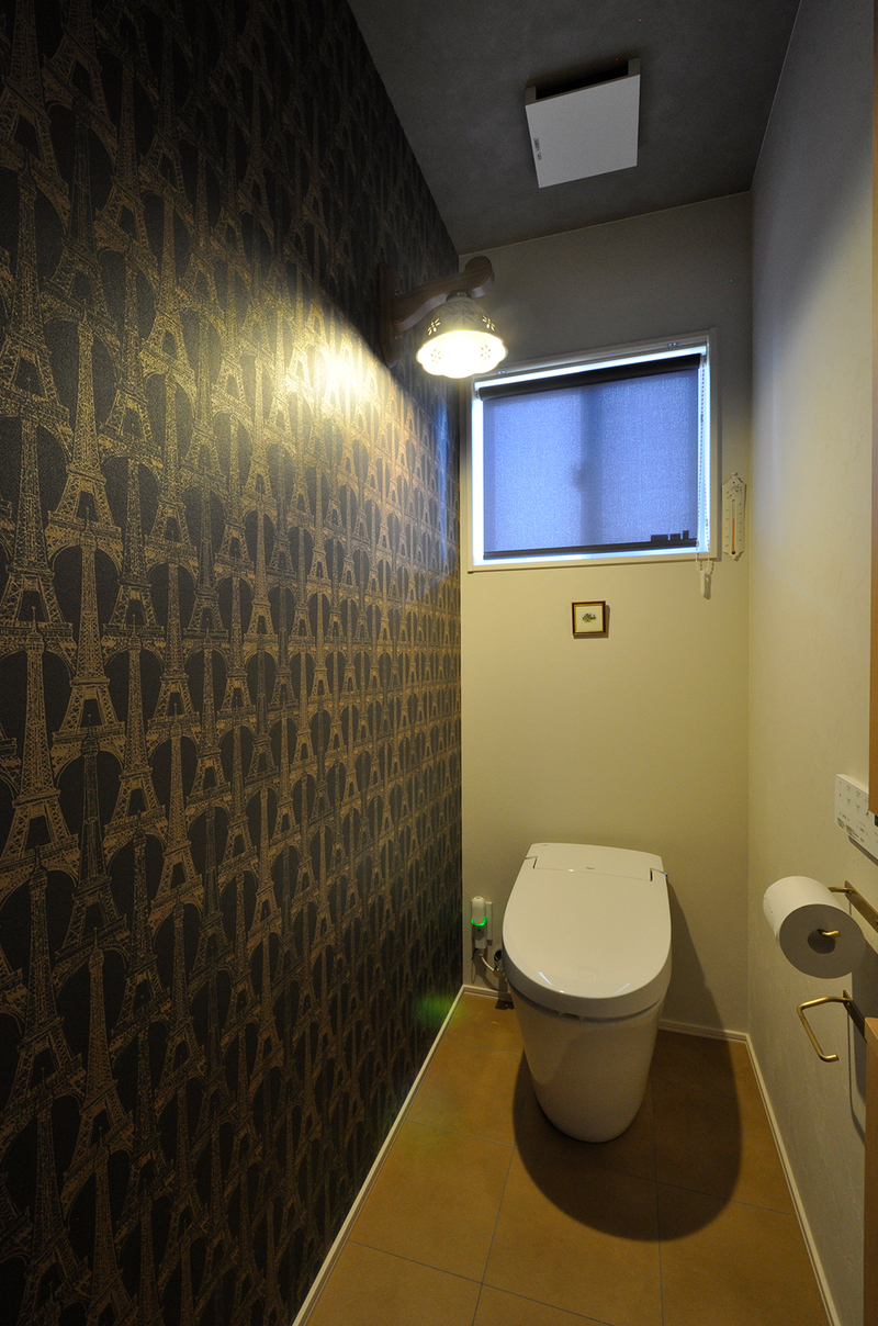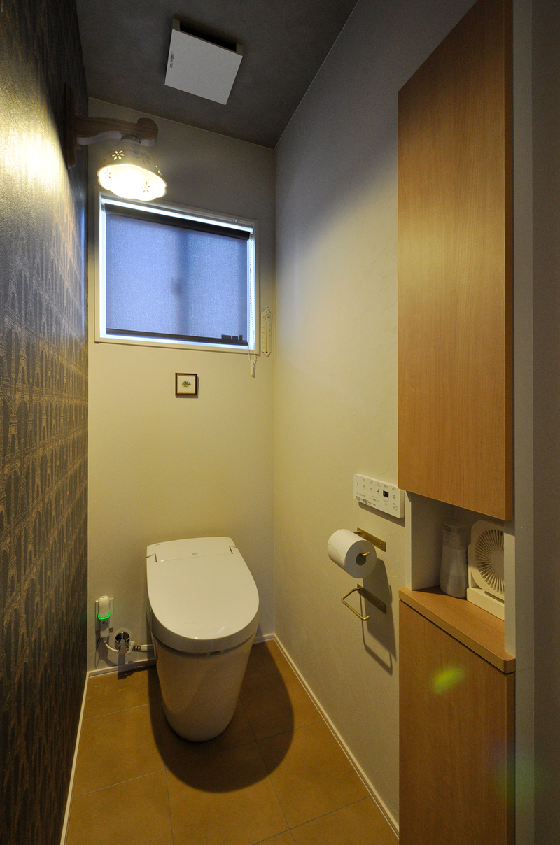 便器は電気お掃除リフトアップ機能でお掃除がしやすいLIXIL/サティスSを設置。アクセントクロスはダーク系の色味にして、お気に入りのブラケット照明が映える、すこし暗めで落ち着いた雰囲気に。