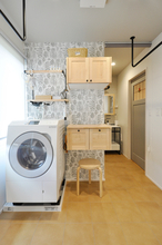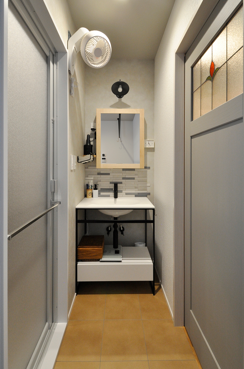 洗面室は最小限にし、ランドリールームを広くして室内物干しができるように。キッチンと直接つながっているので、お料理をしながら洗濯の様子も確認できます。コンパクトな洗面化粧台はサンワカンパニー/フィーネ(W=750)になります。