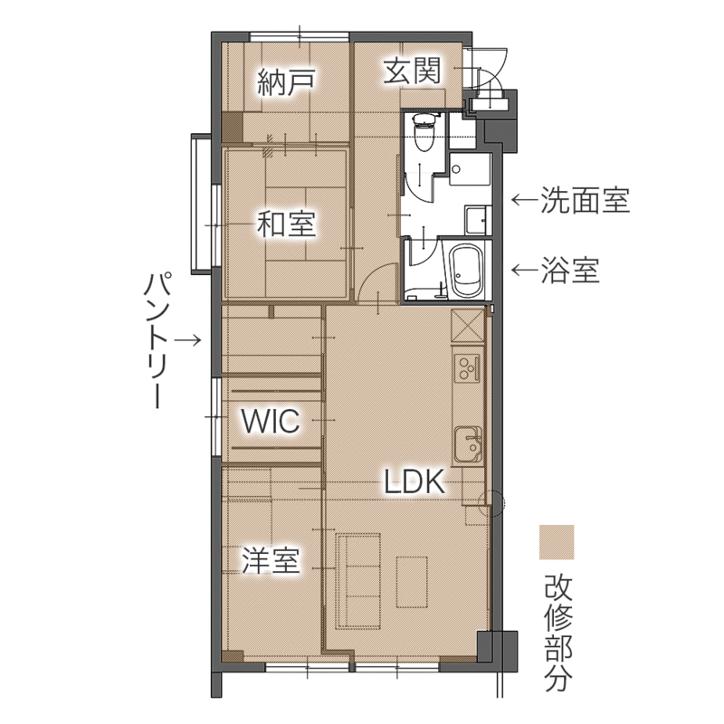 | リフォーム箇所 | リビング、ダイニング、キッチン、ウォークインクローゼット、パントリー、玄関、和室、納戸 |
