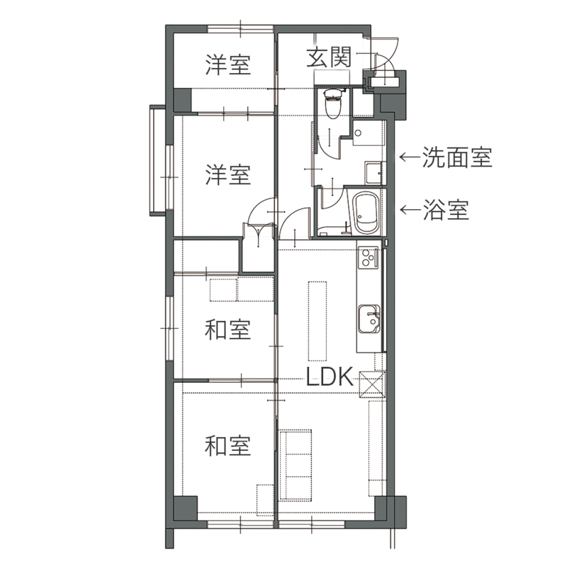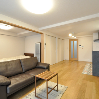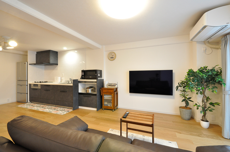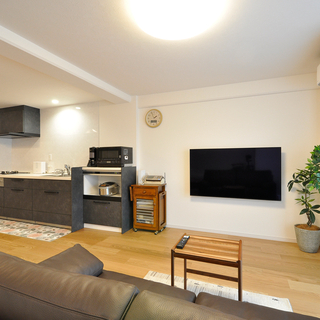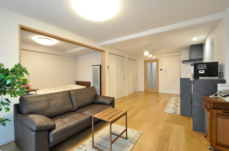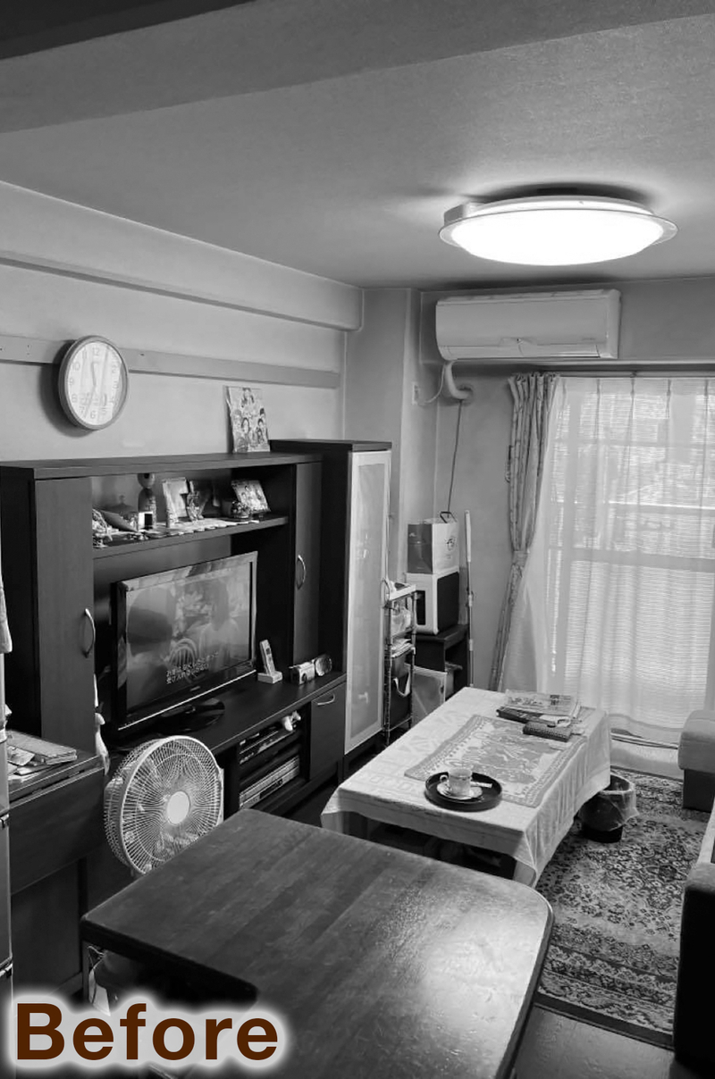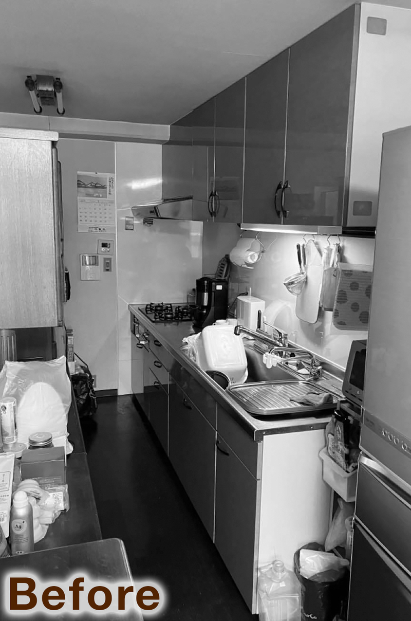 まず南側にあった和室2間は、寝室、ウォークインクローゼット、パントリーへと間取りを変更。収納が充実することで、LDKや居室はすっきりと過ごすことができるように。キッチン周りは余分な収納を撤去し、冷蔵庫の配置を変更してリビングから見て圧迫感がないようにしています。
