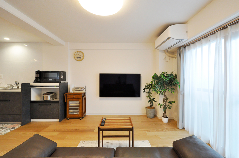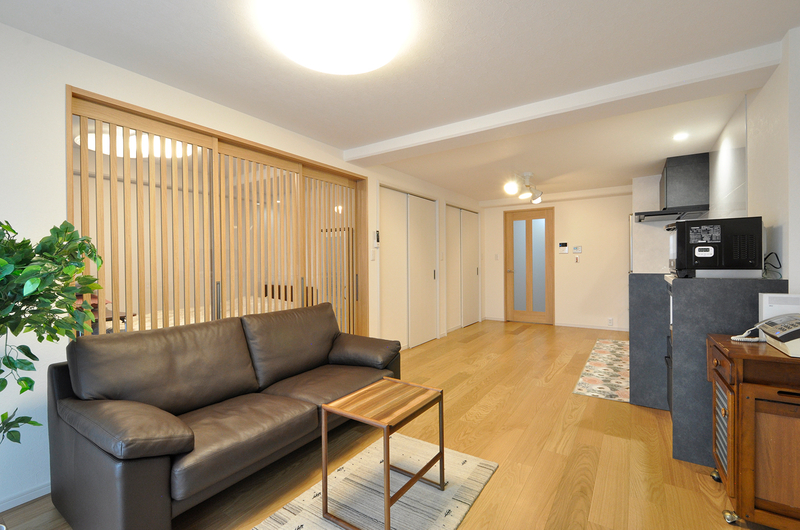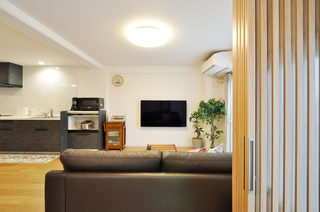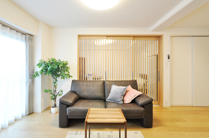 60インチの大きなテレビを壁掛けにするので、ソファとテレビの距離を以前より広く確保。寝室との境は3枚連動引き戸(パナソニック)を設置。木製の縦格子で奥の部屋が透けて見えるので、オシャレでありながら広さも感じられる仕様に。掃き出しの窓も二重サッシを取り付けています。