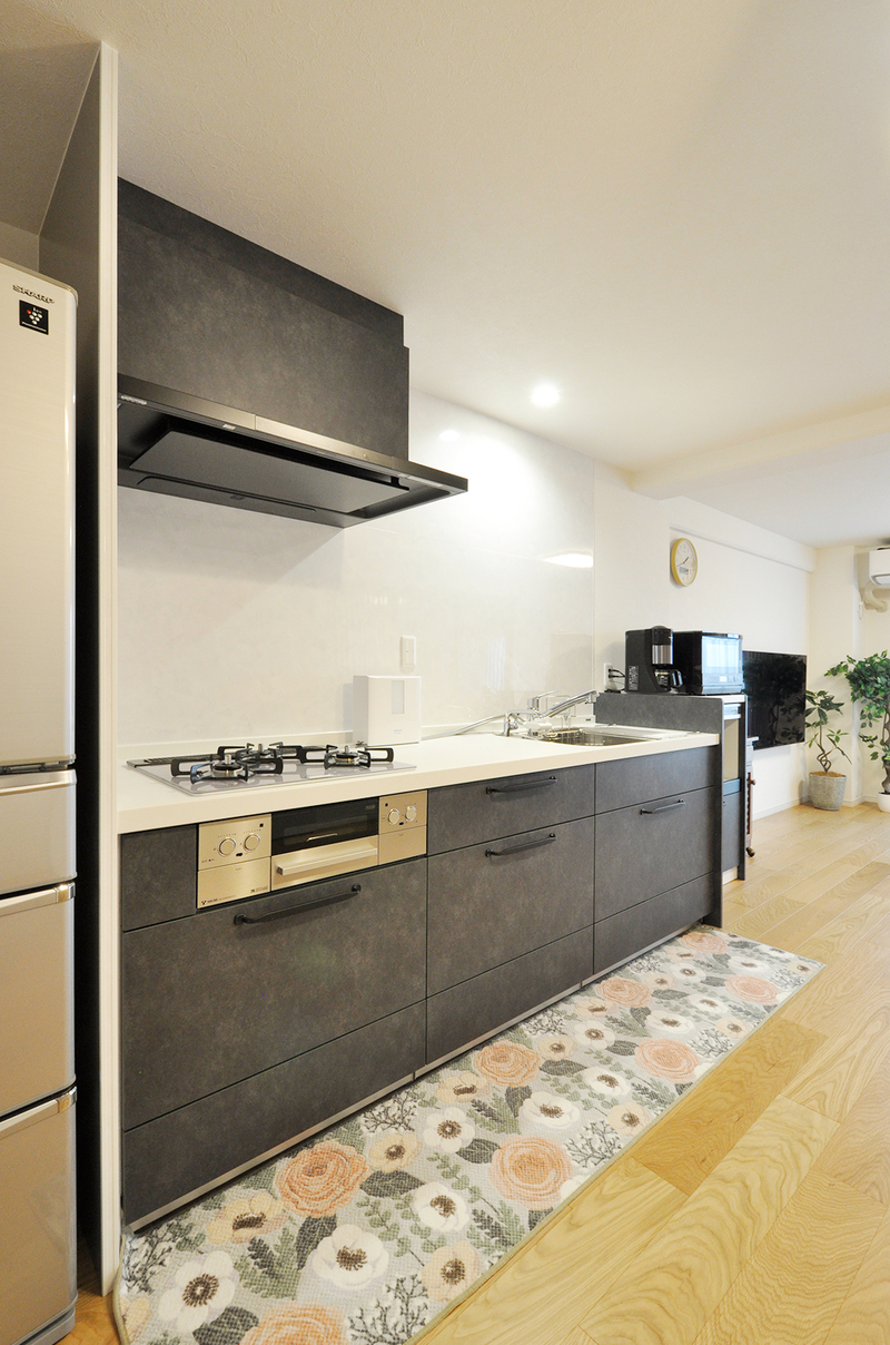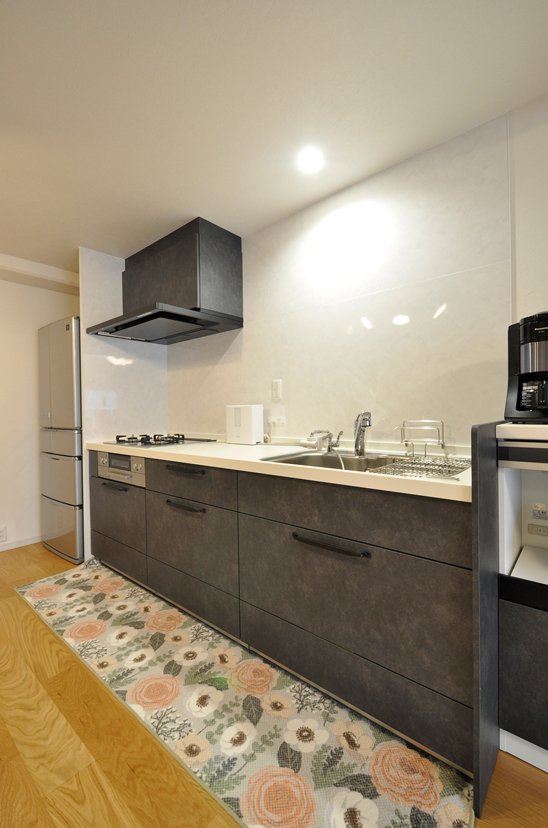 システムキッチンはクリナップ/ステディア(W=2400)。背が高い冷蔵庫は北側に移動させて、背面収納と吊り戸棚を撤去し、リビングから見て広々と圧迫感がないようにしています。