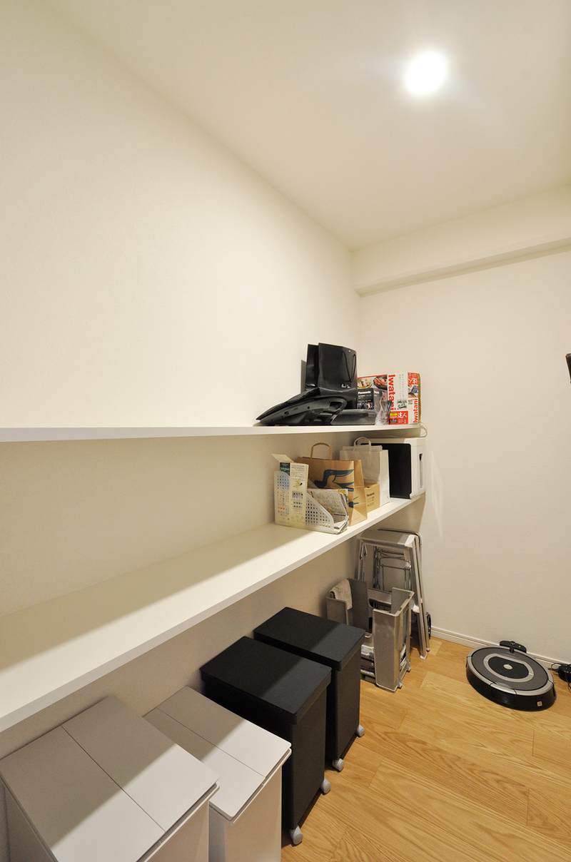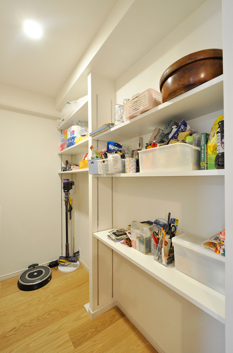 もともと和室だったスペースはウォークインクローゼットとパントリーに刷新。ウォークインクローゼットのハンガーパイプは窓にかからないよう、天井から吊るタイプにして、窓は二重サッシに。パントリーは部屋を入って左側は固定棚、右側は可動棚に。用途に合わせて高さを変えられるので、掃除機など縦長な物もきっちりと収められます。