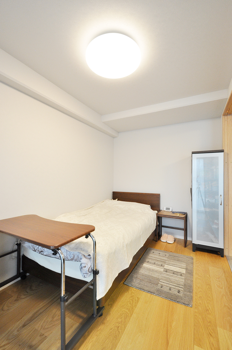 和室から洋室に造り変え、窓は二重サッシに。ベッド、手持ちの収納、鏡台を置いて、ベッドからもテレビが見れるように家具の配置を決めて、最終的に部屋のサイズを決定しています。