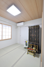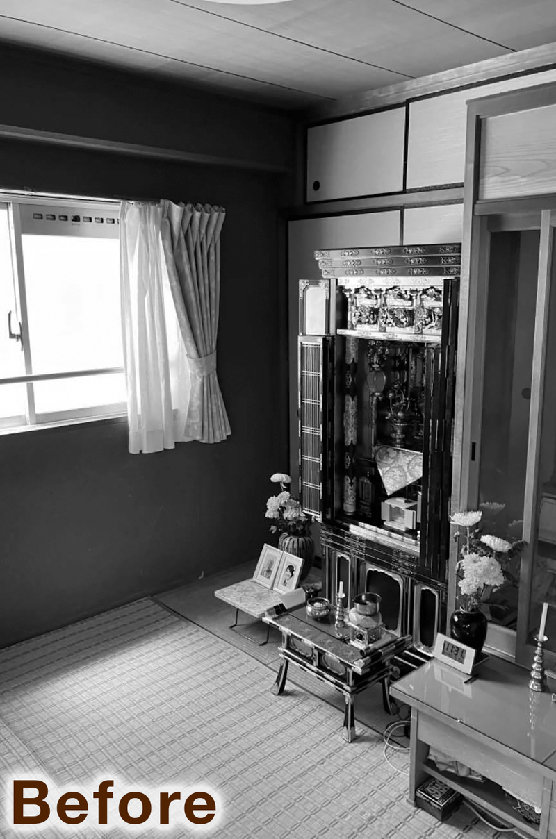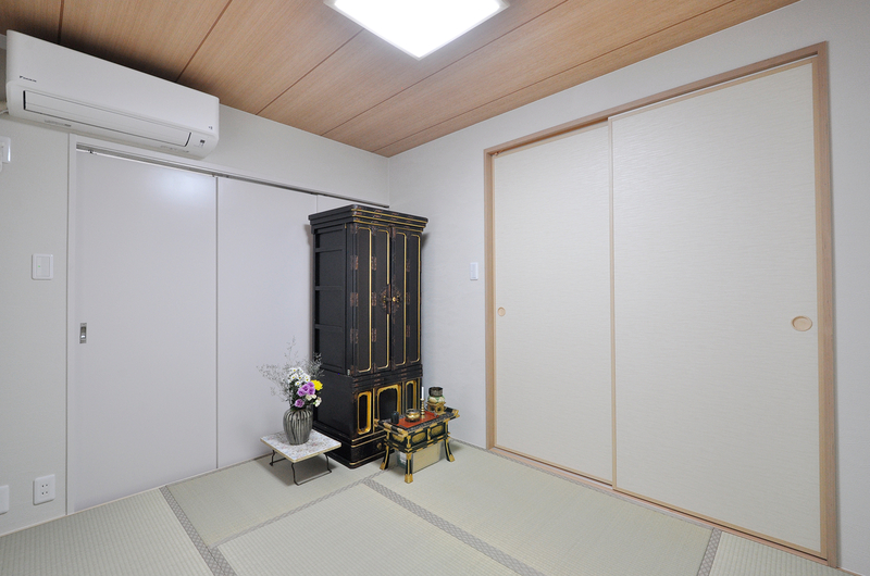 天井・壁・畳と内装をまるっときれいにリフォーム。窓には和室の趣が感じられる障子を取り付け。仏壇を置いても奥にある納戸へ出入りができるようにしています。