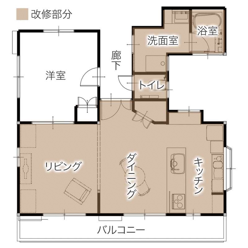 | リフォーム箇所 | リビング、ダイニング、キッチン、浴室、トイレ、洗面室 |