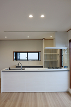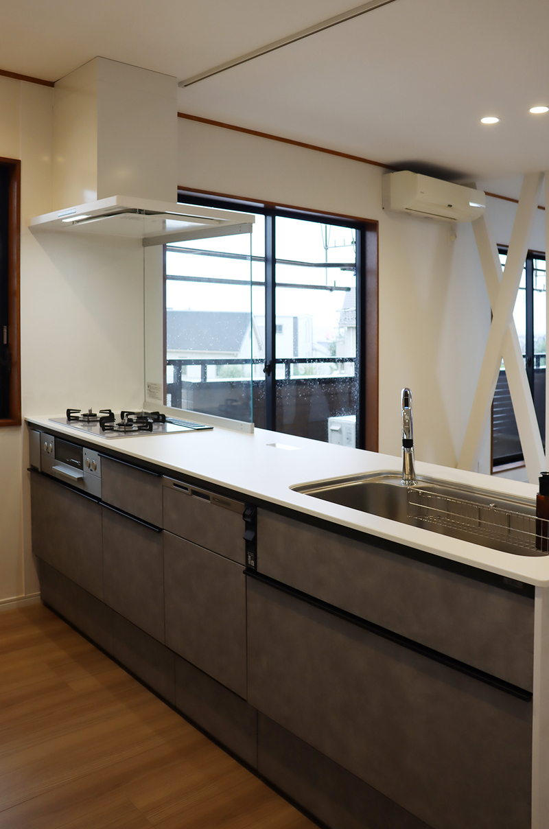 リビングにいるワンちゃんたちを見ながらお料理ができるように、壁付けのキッチンからフラット対面のシステムキッチン(LIXIL/シエラ、W=2574)へ取替え。背面には造付けの収納を設置。可動棚なので買い置き品のサイズに合わせて高さの調整ができます →リフォーム費用(LDK全体で):約270万円