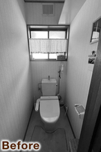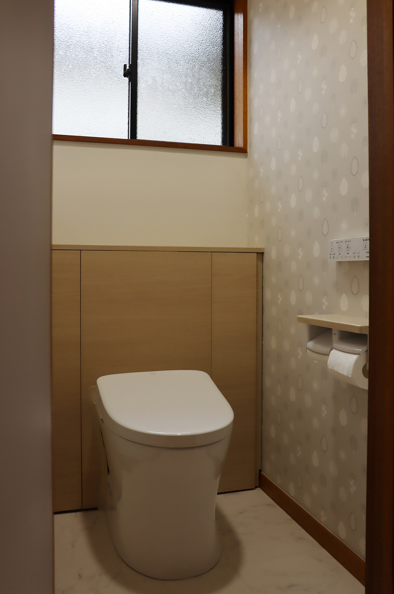 10年くらい前に便座を交換。今回は便器ごとまるっとTOTO/レストパルI型(スリム収納プラン)に取替え。タンクがキャビネット内に隠れているので、掃除がしやすく、収納スペースもあるので、空間がスッキリします。木目調のキャビネット×植物柄のアクセントクロスでナチュラルなトイレ空間に。