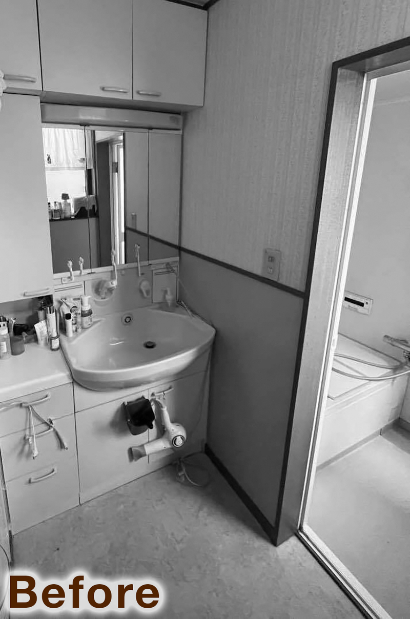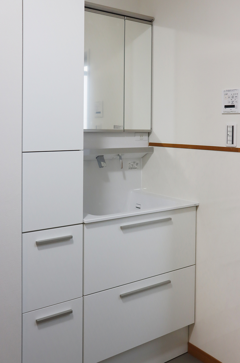 洗面化粧台はTOTO/オクターブ(W=750)に取替え。家族で使う時間帯が重なることがあるため、三面鏡をセレクト。引き出し収納なので、以前と間口は同じですが、収納量がアップしています。グレーのタイル調のクッションクロアに白い塗調の壁紙を合わせ、清潔感があり、落ち着いた雰囲気に。
