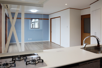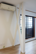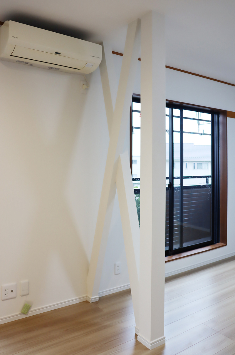 ダイニングと洋室の間の壁・柱を撤去。建物の強度を保つため、天井裏で梁補強。筋交いは新たに入れ直し、クロスを巻いて現しに。床材はイクタ/プリオス介護とペットに張替え。汚れやキズがつきにくく、滑りにくいのでワンちゃんの足にも優しい床材です。