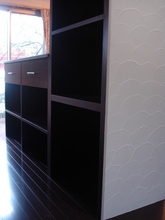 壁は珪藻土を使用して波をうったような模様の扇塗りに仕上げました。濃い色目の床材や家具にも調和し、落ち着いた雰囲気になりました。