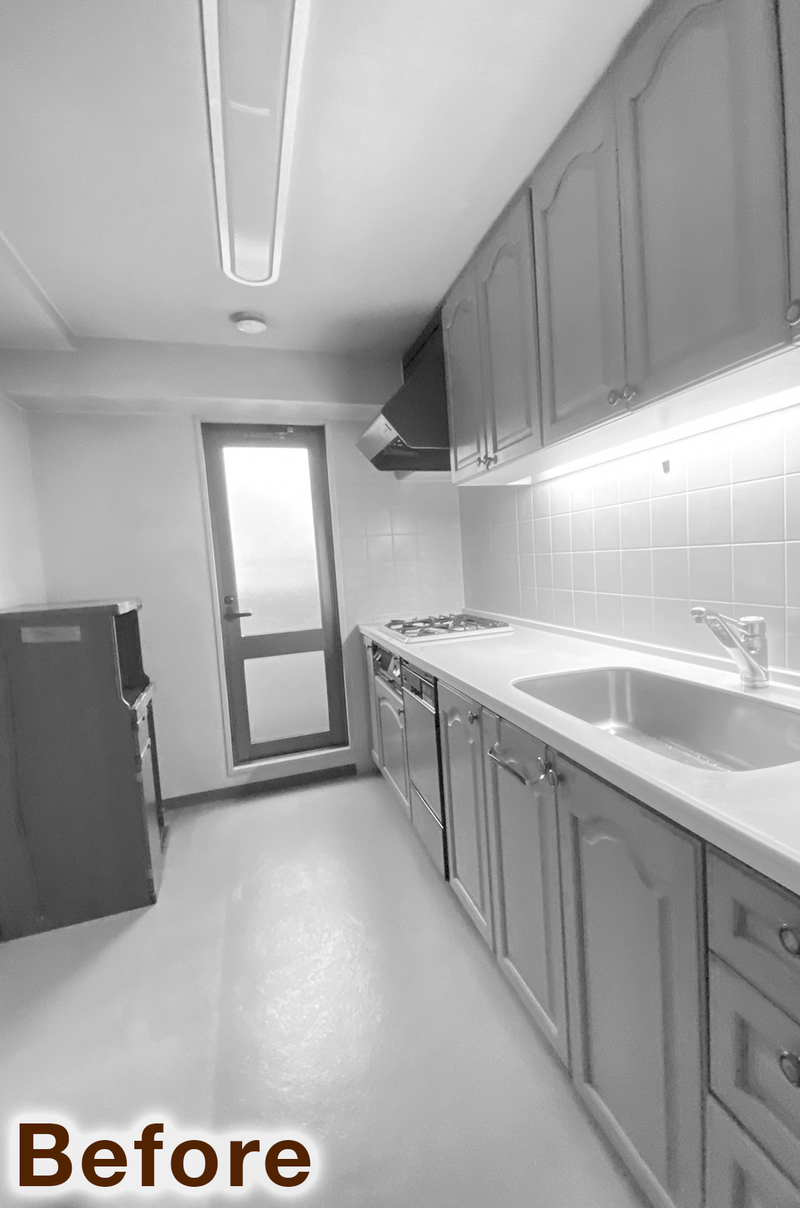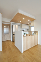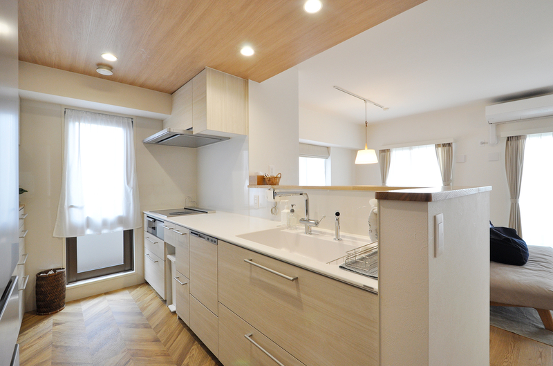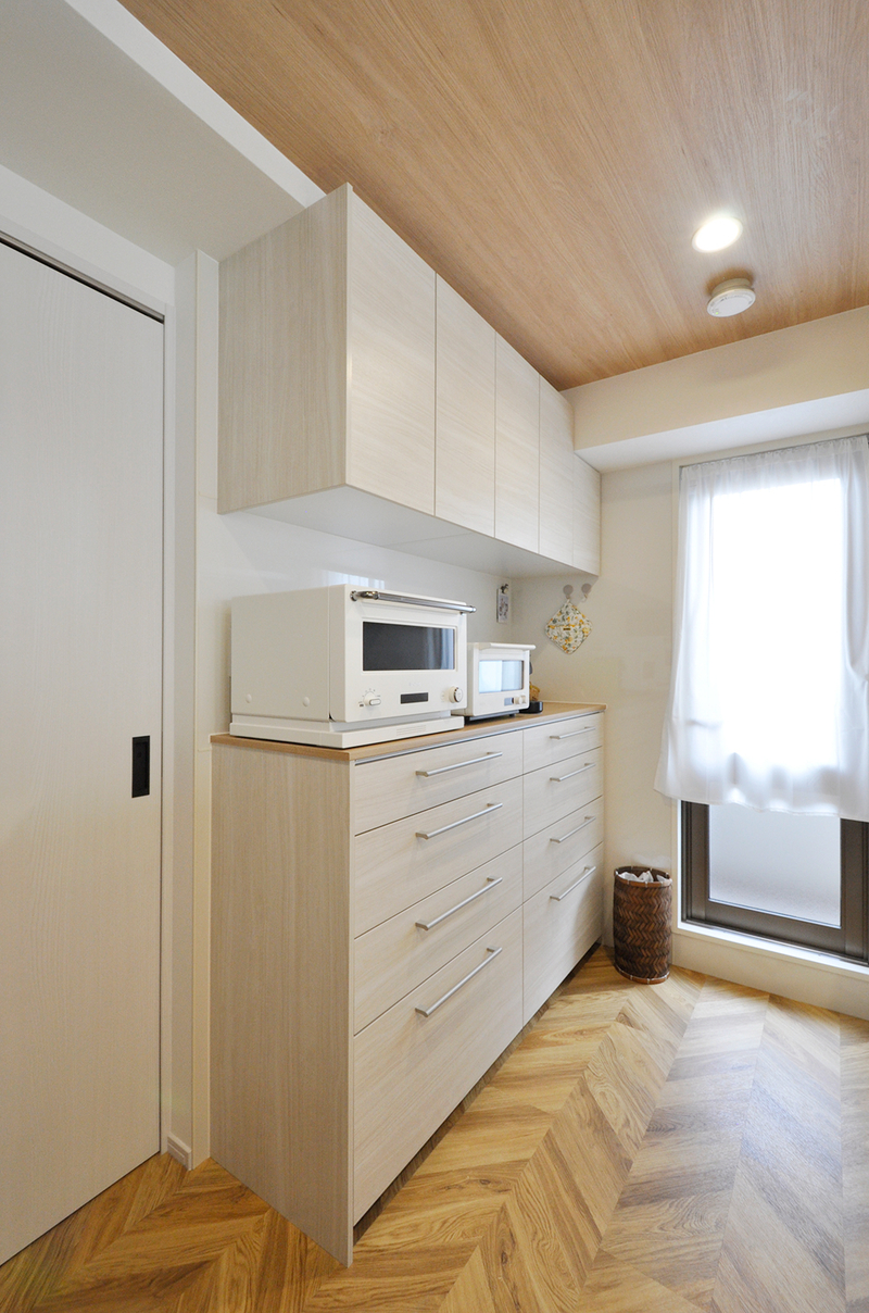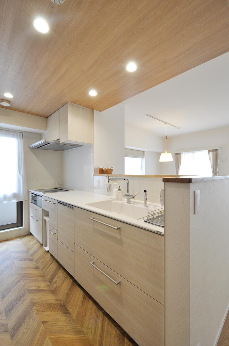 クローズキッチンから、壁を撤去し光と風を感じられるオープンな対面キッチンへ。リビングダイニングにいるご家族とも顔を見てコミュニケーションが取れます。システムキッチン(W=2869)・背面収納(W=1540)はTOTO/ザ・クラッソで統一。折り上げ天井を薄めに造作し、より洗練されたイメージに。