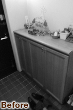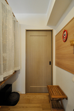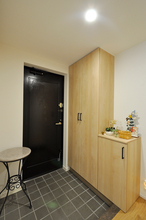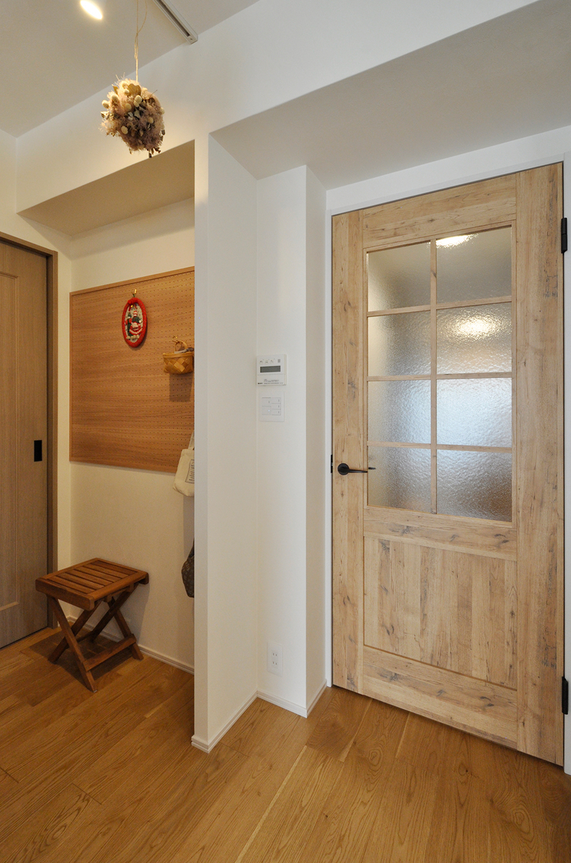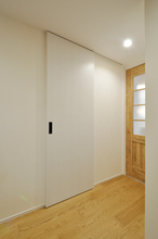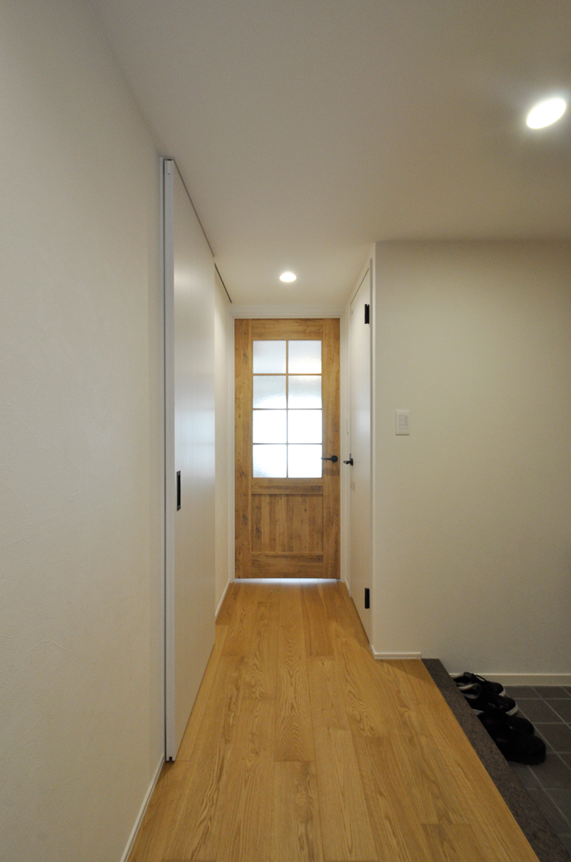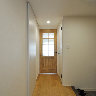 玄関を入って真正面にある洗面引き戸は、天井埋込レールのアウトセット引き戸にしスッキリと。玄関収納(Panasonic/コンポリア)も収納力とディスプレイを兼ね備えた収納にリニューアル。