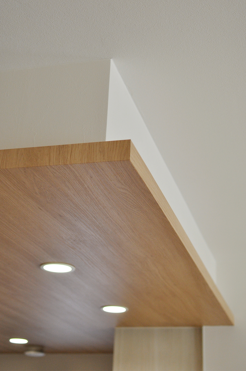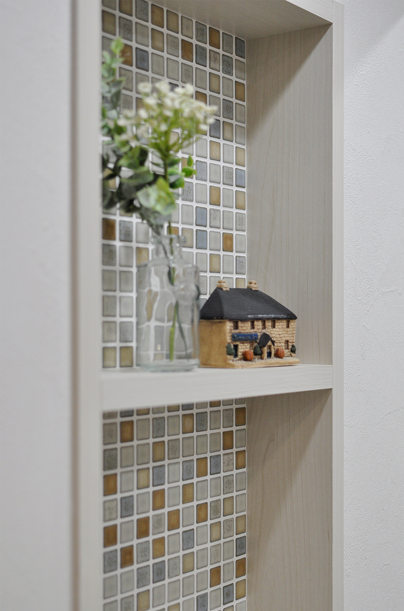 キッチン腰壁前に造ったキャビネット、キッチン天井、リビングドア(Panasonic/クラフトレーベル)の木目の色調を統一し、シンプル&ナチュラルな雰囲気のリビングダイニングに。キャビネットはディスプレイが楽しめるようニッチ部分を高めに設定。背面にはモザイクタイル風のアクセントクロスで上品に仕上げています。ガラス交換や内窓も施し、断熱対策をしています。
