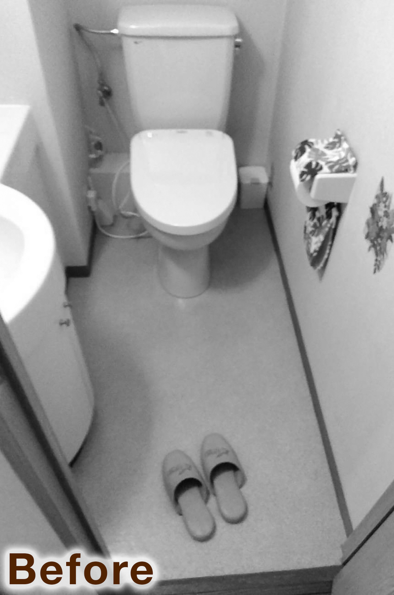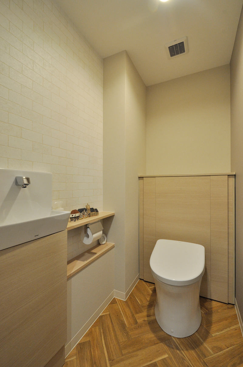 以前はタンク付きだった便器は、清掃性と収納力を兼ね備えた背面キャビネットタイプの便器(TOTO/レストパルI型)に。手洗いまわりは、配管部分を腰壁で覆い隠し、棚板で造作したオリジナル。