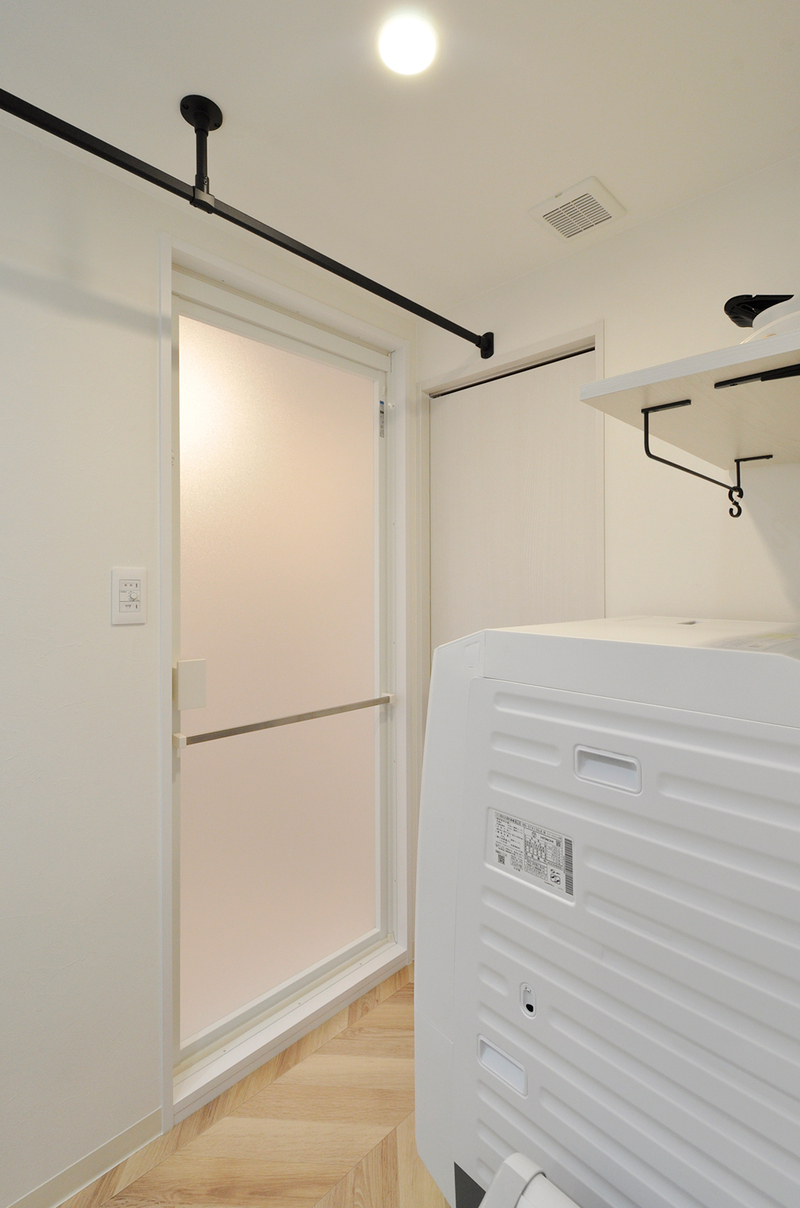 引き出し収納たっぷり、ハイバック水栓で汚れにくい壁一面の洗面化粧台はTOTO/オクターブ。洗面横には背面にモザイクタイル(LIXIL/スマートモザイクシート)を施したオシャレなニッチ。天井にはブラックがかっこいい物干しパイプを設置。