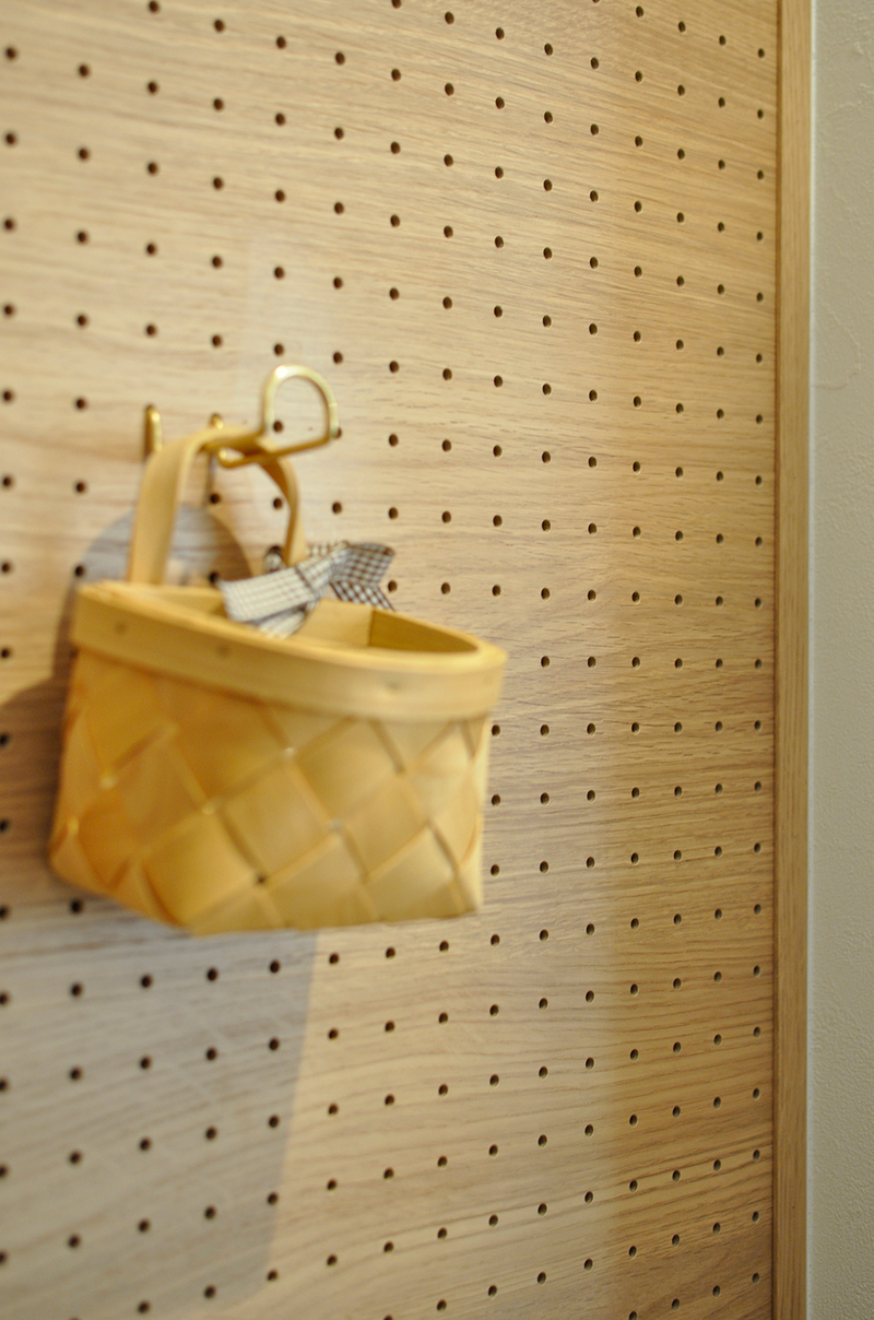 キッチンすぐ横は収納力と有孔ボードのあるパントリー。あえて天井まで壁を設けずに圧迫感を抑えています。その先にあるウォークインクローゼットから寝室へと通り抜けも可能です。