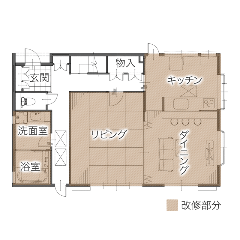 | リフォーム箇所 | リビング(畳スペース)、ダイニング、キッチン、浴室、洗面室 |
