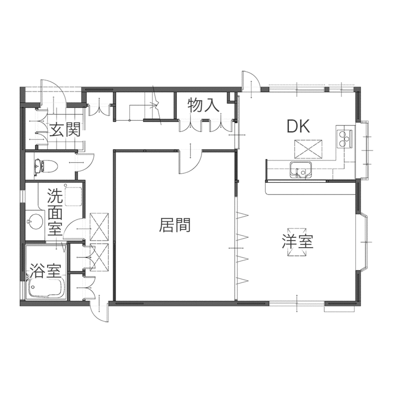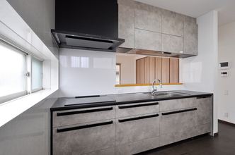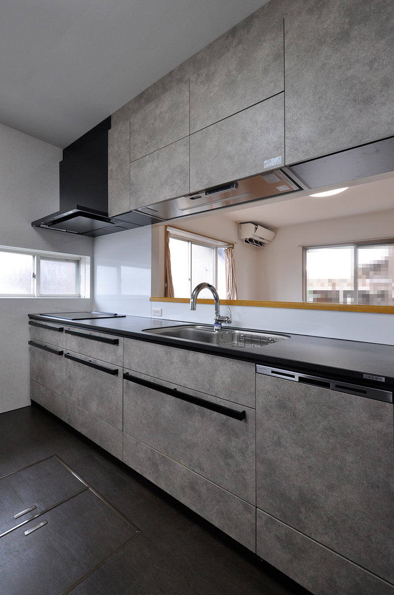 浴室は物入れだったスペースを取り込むことでサイズアップを実現。キッチンは使い勝手がよかったカウンターは残し、機能性(収納力・IHコンロ・食洗機など)の高いシステムキッチンを導入。既存の建具を残しても内装バランスが崩れないよう床材はダーク系にして、落ち着いた雰囲気にしました。