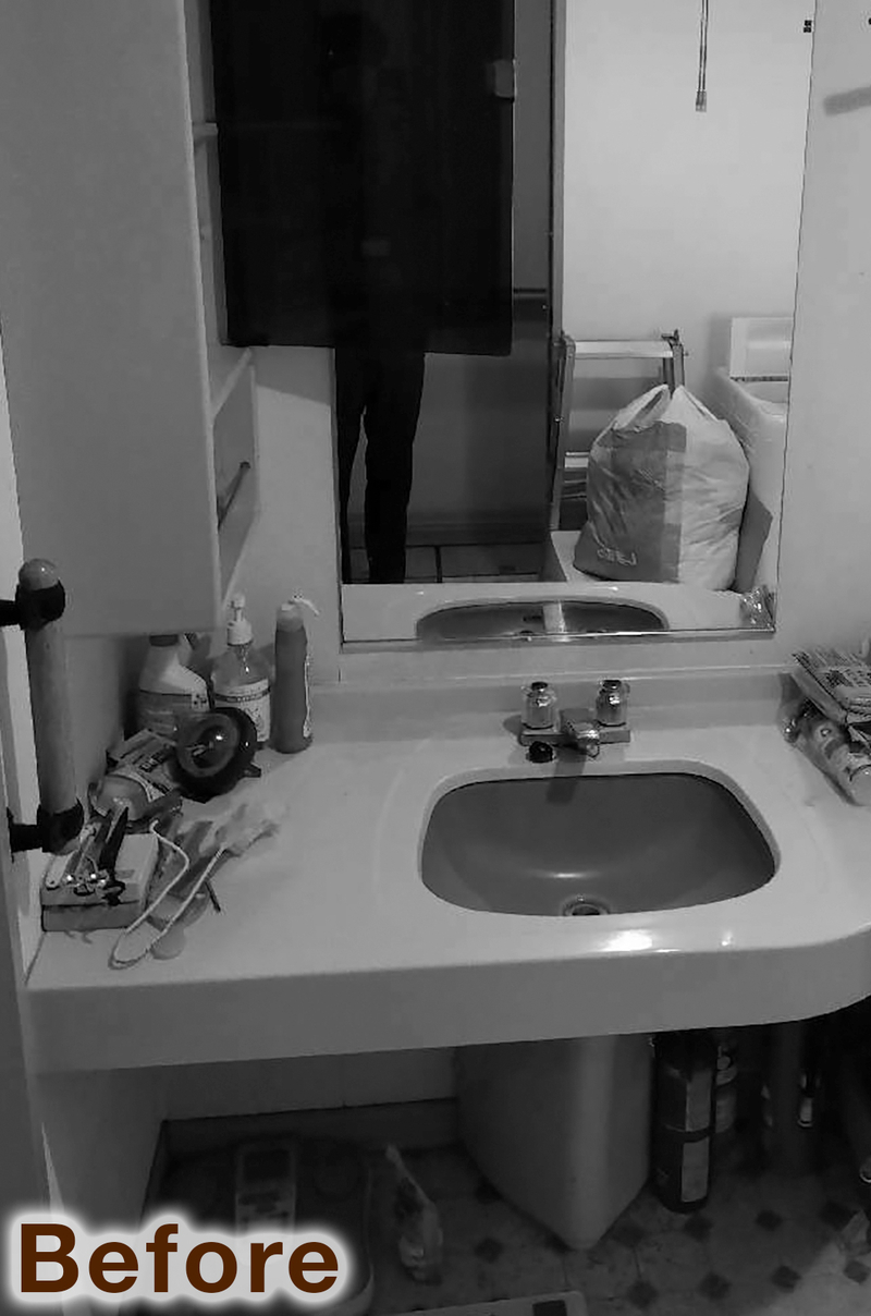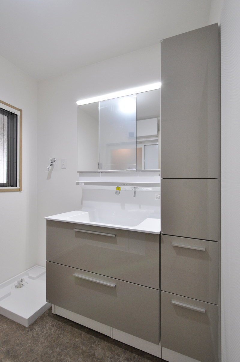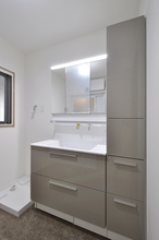 洗面台や洗濯機置きの場所を変更し、収納付きの洗面化粧台(TOTO/オクターブ、W=900)を採用。収納が増えて使い勝手が◎に。