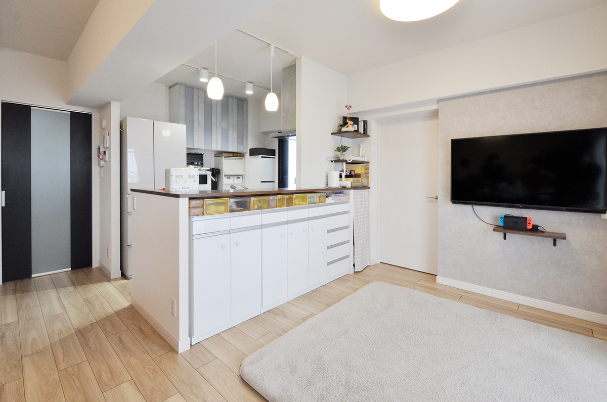キッチンとリビングを仕切っていた垂れ壁と袖壁を撤去し、開放感のあるLDKに。リビングのドアはホワイトカラーに、床は明るいグレージュ系のフローリングを採用。以前よりもぐっと広く、明るい雰囲気のリビングに生まれ変わりました。