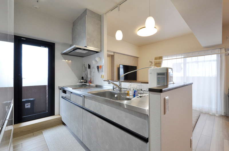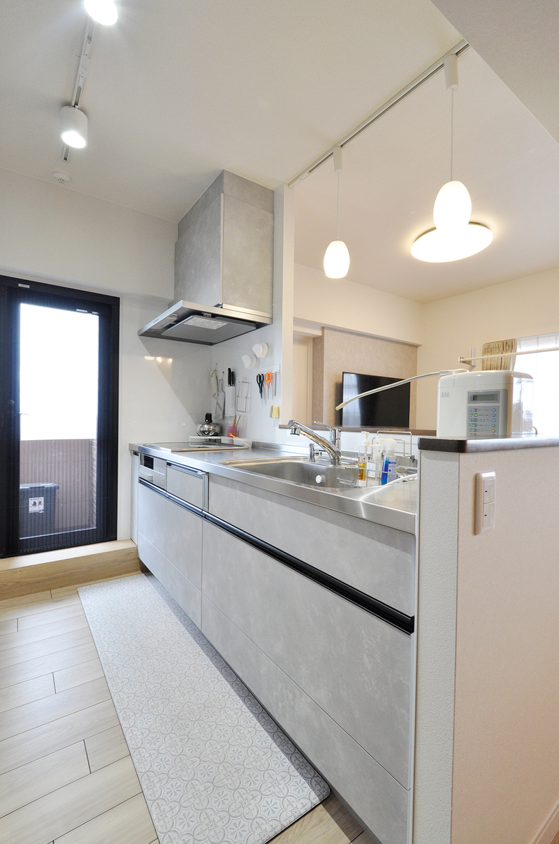 キッチン本体はクリナップの「ステディア(W=2412)」を採用し、背面収納の吊り戸棚には「ラクエラ」を組み合わせ。さらに、壁パネルはマグネット対応なので、キッチン小物を好きな場所に貼り付けられてとても便利!照明も、以前の細長いシーリングライトから一新。配線ダクトレールを取り付け、ペンダントライトとスポットライトでお洒落な雰囲気に。