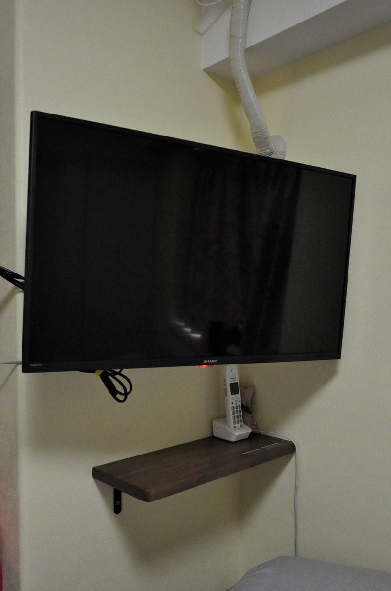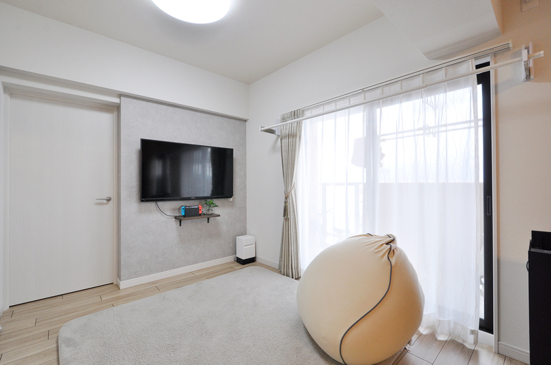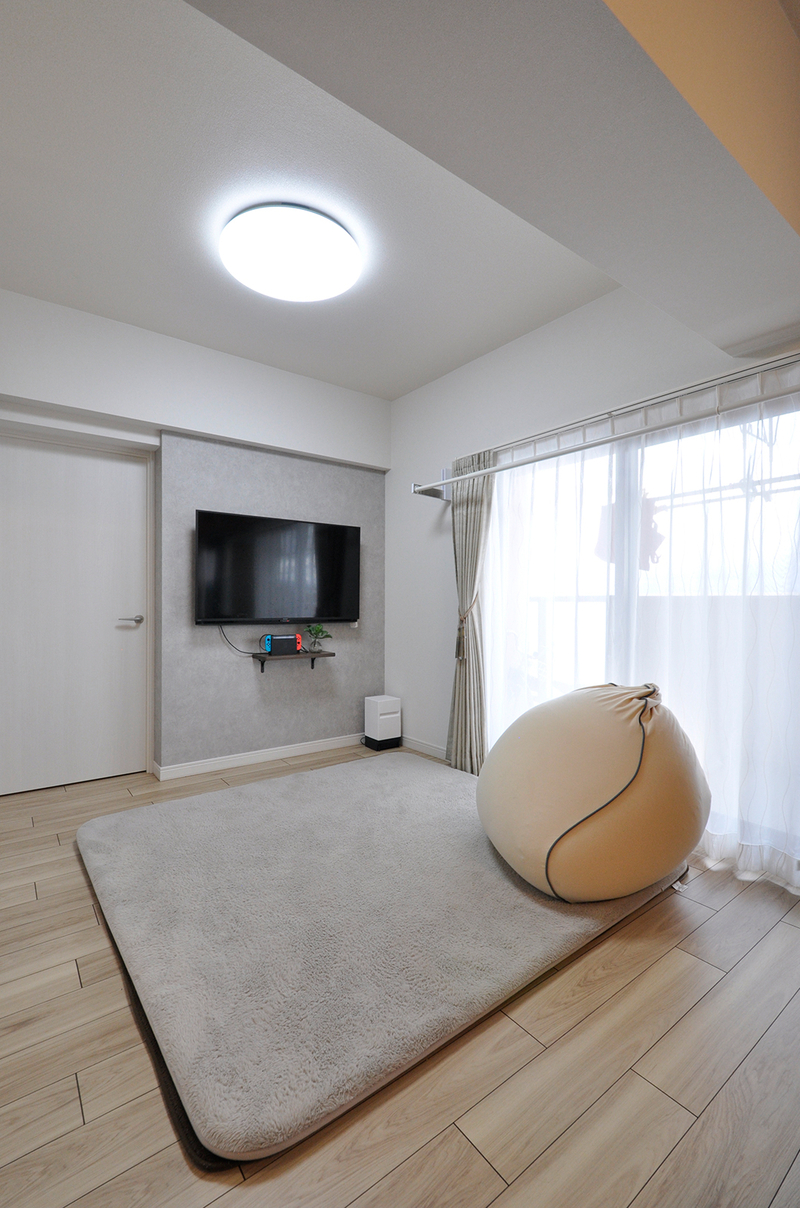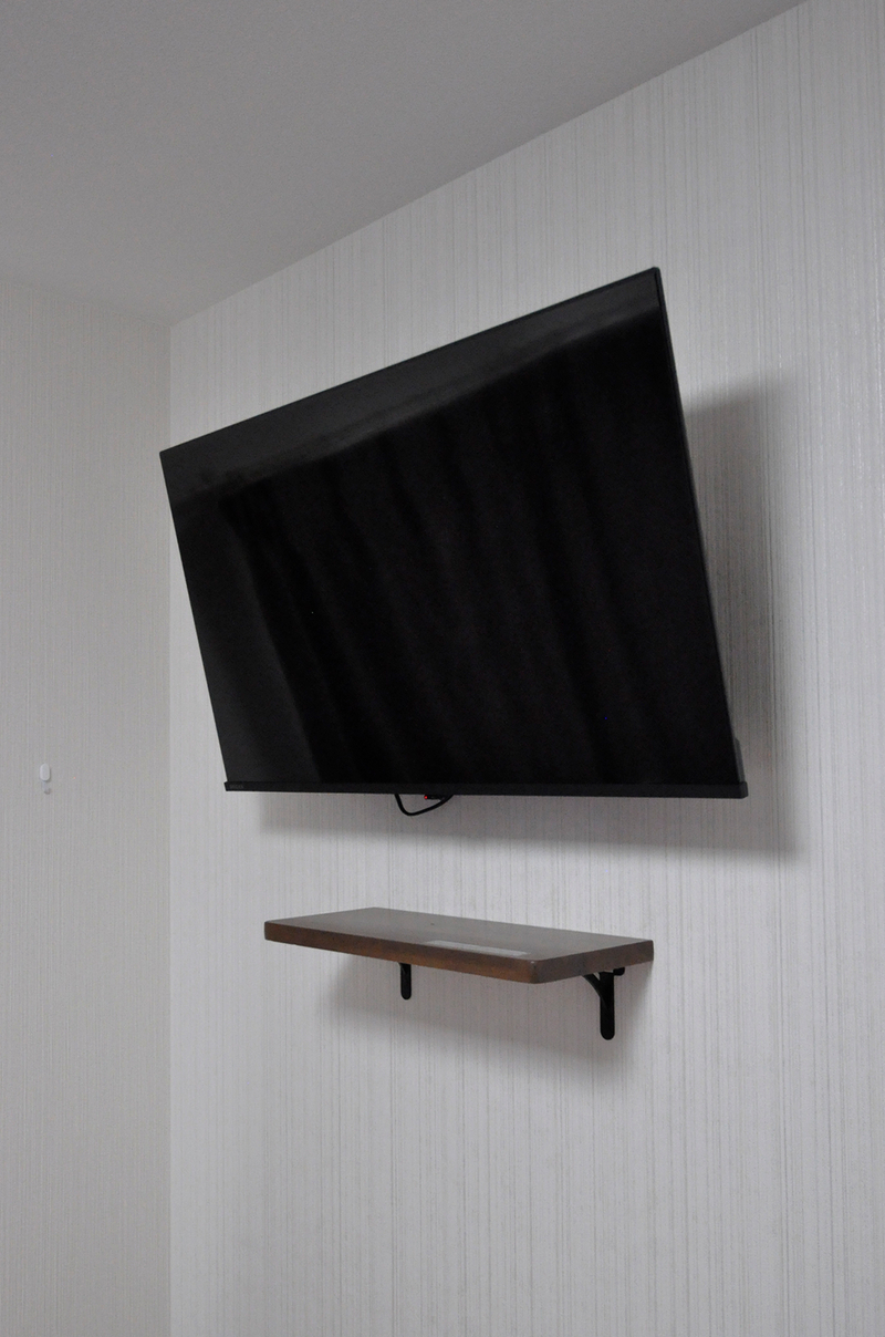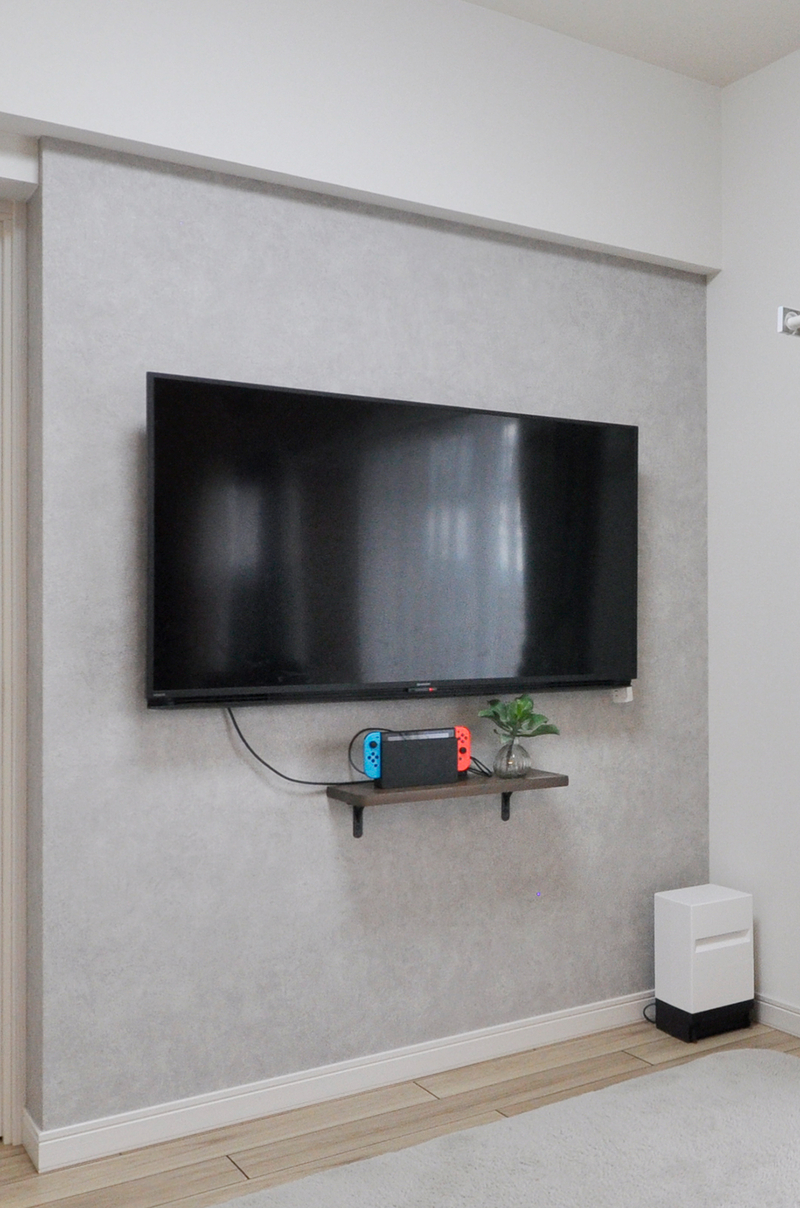 リビングだけでなく、各寝室にも壁掛けテレビを設置。見る位置や高さに合わせて、それぞれの壁掛け金物の機能も工夫。上下・左右に角度調整ができるタイプや、アーム付きのタイプなど、使いやすさにこだわって選びました。さらに、リモコンや小物を置けるよう、テレビの下には固定棚も設置。テレビボードを置かなくて済むので、空間がとてもすっきり見えて、部屋全体が広く感じられるようになりました。