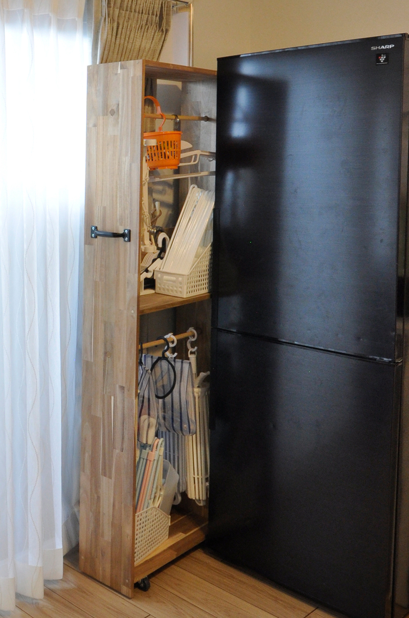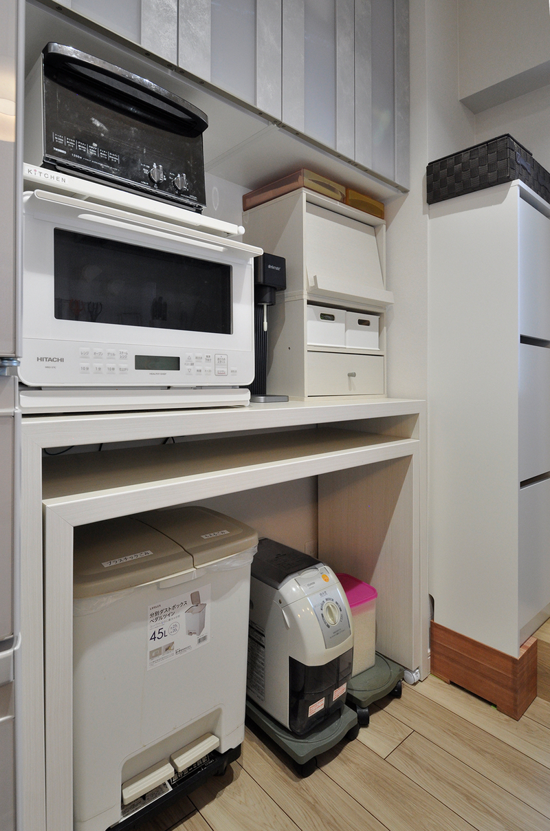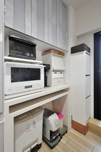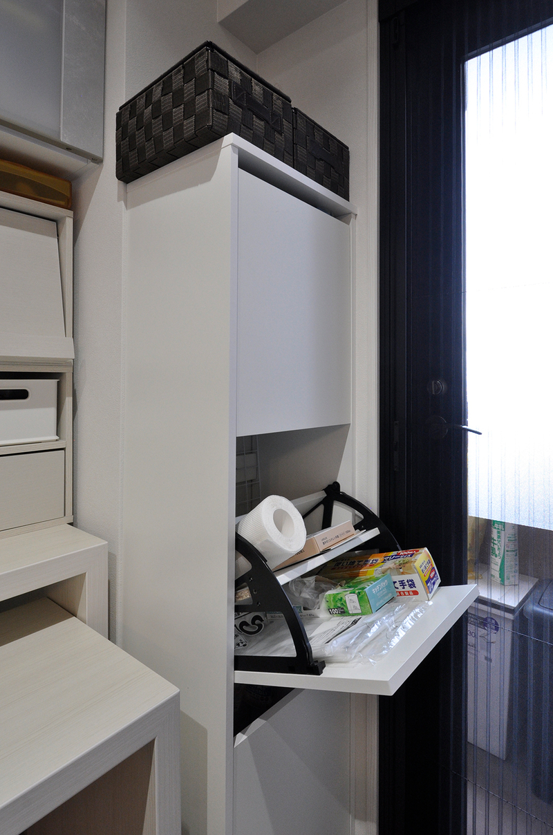 ②キッチンコーナーには、玄関収納をアレンジしたキッチングッズ収納を設置。収納力も使い勝手も◎。