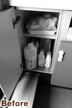 以前は、排水配管スペースの影響で床が一段高くなっており、幅の狭い開き扉収納ではなかなか使いこなせずにいました。