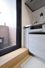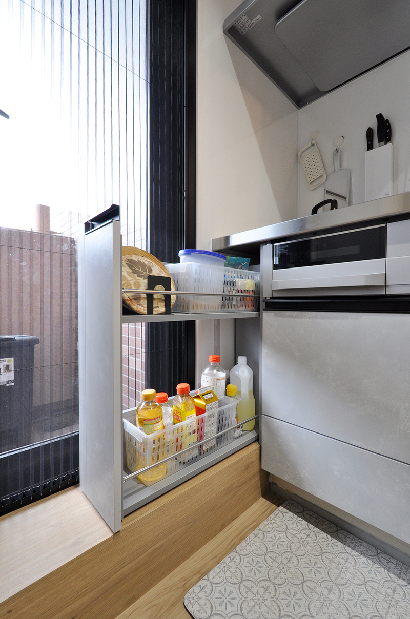 今回のリフォームでは、キッチンメーカーの扉面材を利用し、キッチン本体と統一させたスライド収納に。内部はスペースにぴったり合うサイズでボトルラックを造作し、収納力も大幅にアップ。取り出しやすさも格段によくなり、毎日のキッチン作業がとても快適になりました。使い勝手の良さに、思わず笑顔がこぼれるお気に入りのスペースになっています。