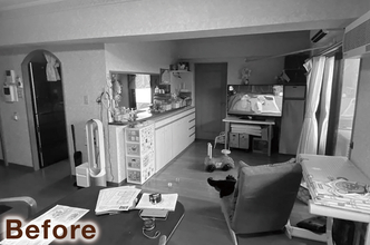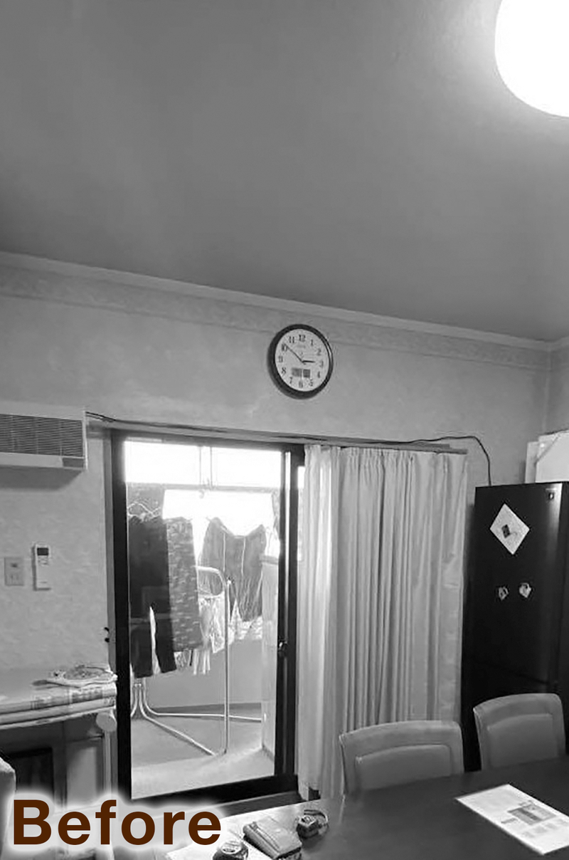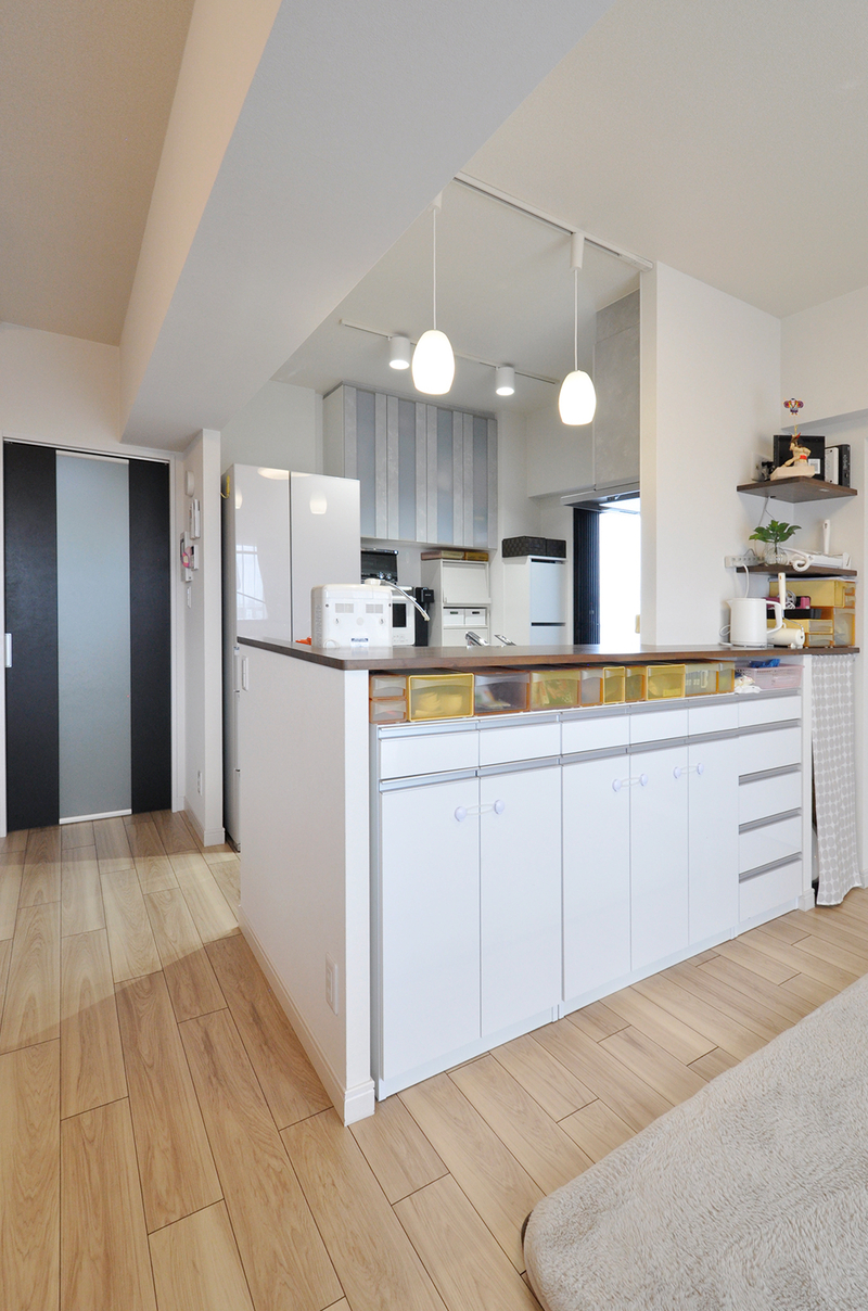 また、キッチンカウンターは、お手持ちの収納ラックがぴったり収まるように、幅や奥行きを細かく調整。見た目もすっきりと整い、使い勝手も抜群です。さらに、廊下からリビングへつながる入口には、戸袋引込み式の引き戸を新設。普段は開け放していても邪魔にならず、動線もスムーズになりました。