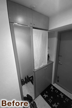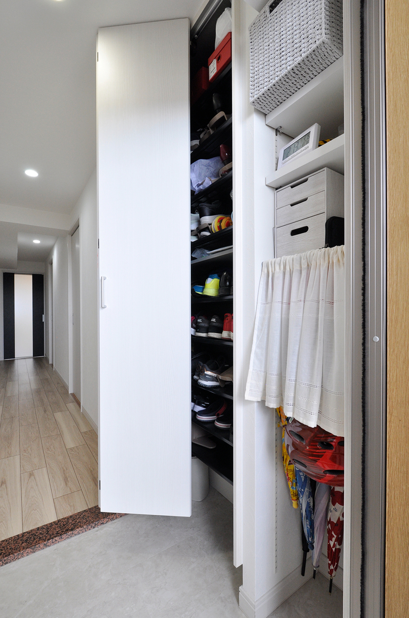 空いたスペースにはオープンの可動棚を設置。傘や小物類をすっきり置けるので、とても便利になりました。さらに、土間部分にはモルタル風のフロアタイルを施工し、スタイリッシュな仕上がりに。玄関ドアには網戸も取り付けて、風通しも良くなって快適な空間になりました。