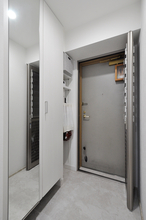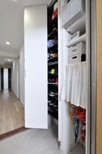 玄関の収納力をアップするため、天井から土間までたっぷりと収納できるクローゼットタイプの玄関収納(Panasonic/クロークボックス、ホワイトアッシュ柄)を選択。ホワイトカラーにミラー付きのデザインで、玄関がパッと明るく、洗練された印象に。