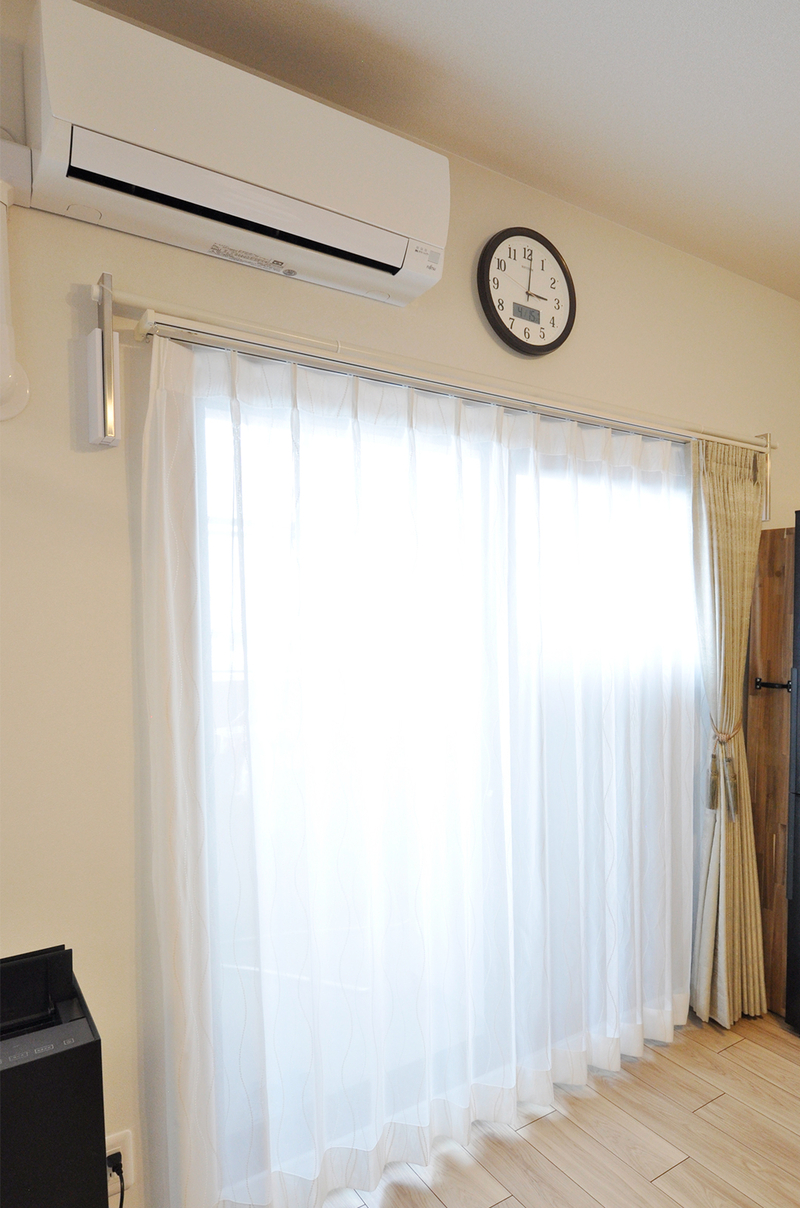 また、サッシ上部には折りたたみ式の室内物干しを2カ所に取り付け。普段はコンパクトに畳んでおけるので、目立たず見た目もすっきり。必要なときだけ広げて使えるので、とても便利です。(室内物干し:ご支給品)