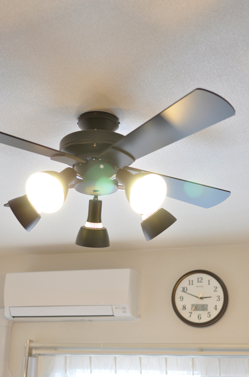 エアコンの位置を移動し、天井にはおしゃれなシーリング付きファンを設置。これにより、室内の空気が効率よく循環するようになり、冷暖房の効きがぐっと良くなりました。
