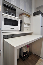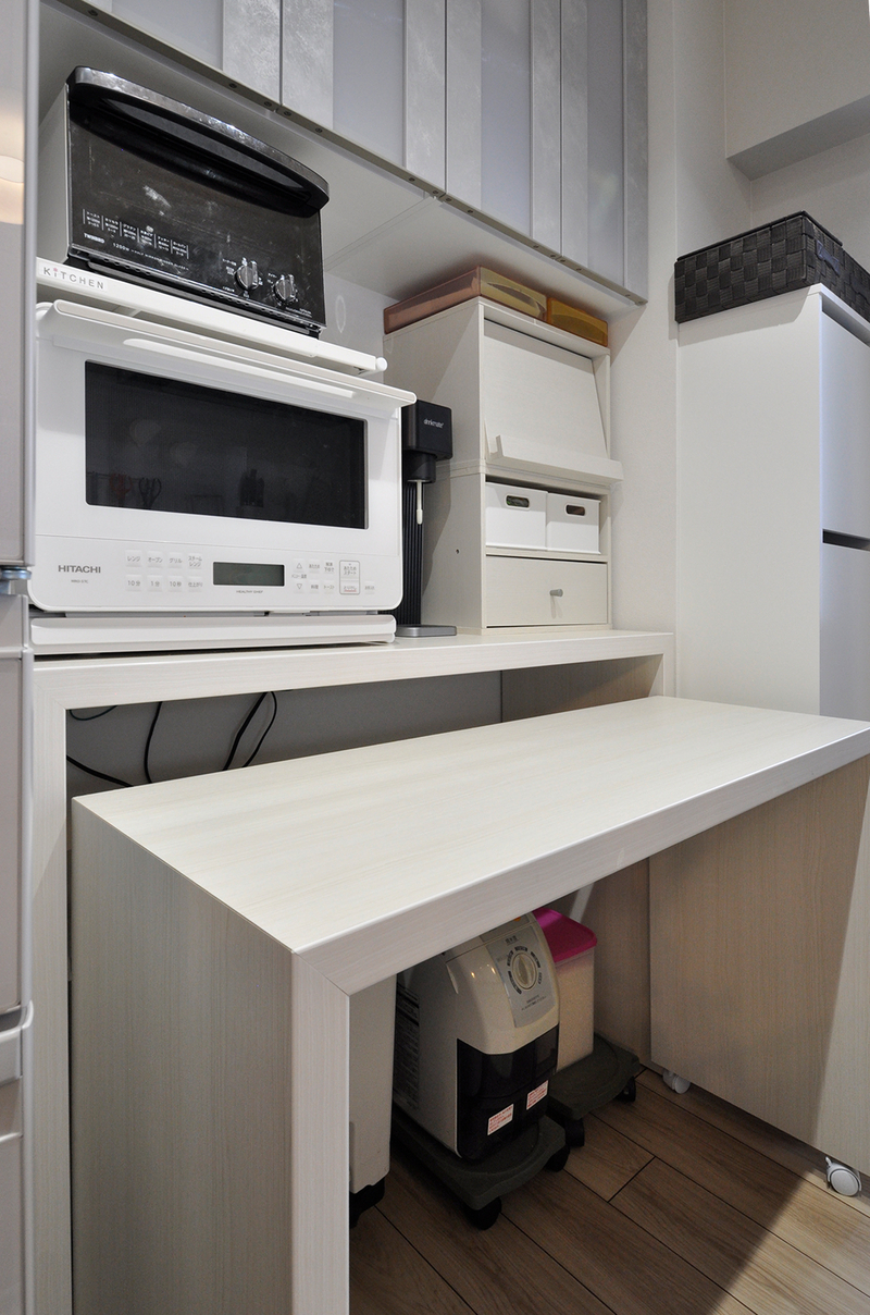 ①キッチン背面には、スライドで出てくる配膳カウンターを設置。必要なときだけ引き出せるので、とても便利。