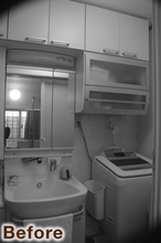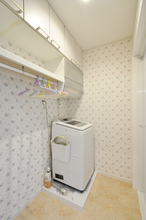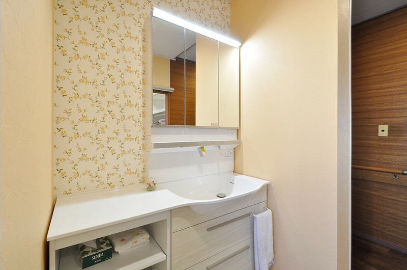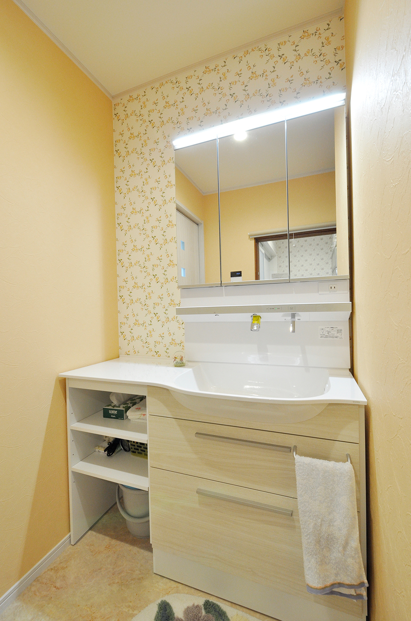 もともと洗面台と洗濯機が並んでいた脱衣室ですが、収納を増やしたいと思い、洗面化粧台を以前物入れだったスペースへ移動しました。その分、脱衣室にはゆとりが生まれ、空いたスペースにパイプハンガーを設置。洗濯後の衣類を掛けたり、着替えを置いたりと、とても使いやすくなりました。洗面化粧台は奥行きの浅いTOTOのオクターブスリム(W=1200)を採用し、限られた空間でも広く感じられます。洗面・脱衣それぞれにお気に入りの花柄クロスを選び、明るく温かみのある空間に仕上がりました。