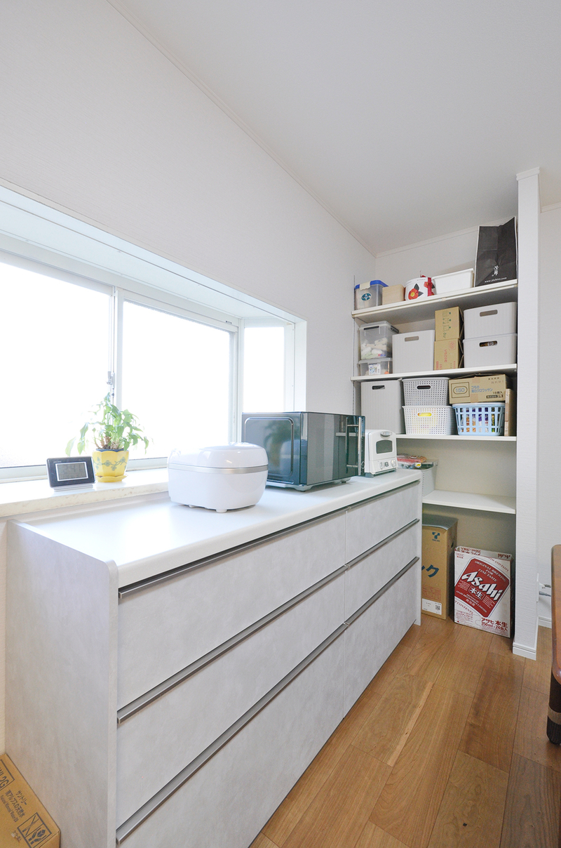 吊戸棚は手が届きにくいため設けず、その分、引き出し式のキッチン本体(LIXIL/シエラ、W2700)に加え、カウンター収納(W1800)とL字に配置したパントリーで、たっぷりと収納できるように。見た目もすっきりと整い、使いやすさと収納力のどちらも満足できるキッチンになりました。