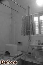 お母様が安心して入浴でき、お掃除の負担も軽くなるようにリフォーム。浴室はサイズを変えず、TOTO「サザナ HTシリーズ Pタイプ(1216サイズ)」を採用。手すりを各所に設置し、あたたかく滑りにくいほッカラリ床で一人での入浴も安心です。床ワイパー洗浄でお手入れも簡単に。寒さ対策として内窓を設け、爽やかなグリーンの壁パネルで明るい浴室になりました。