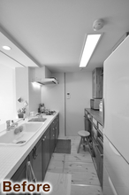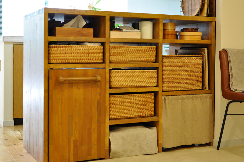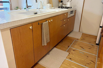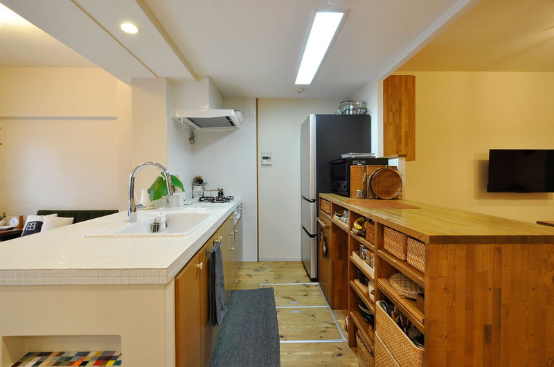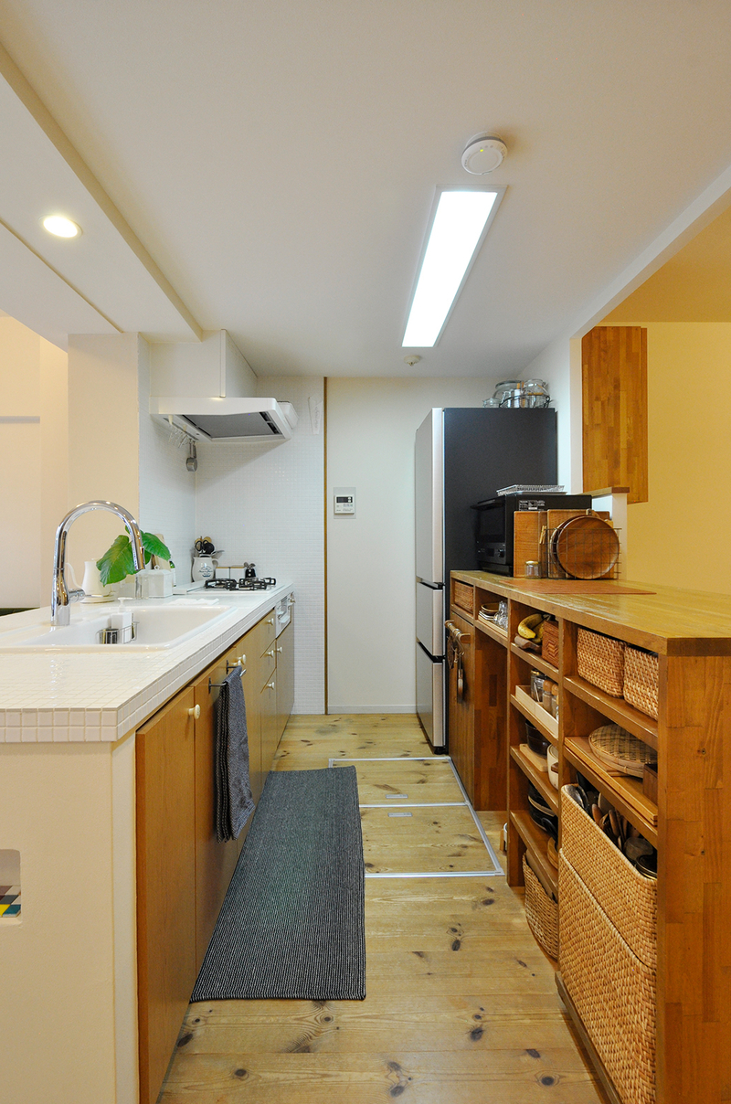 キッチン背面の壁を取り払い、ダイニングと向かい合うレイアウトへと見直しました。以前から大切に使われていた、集成材で造作したカウンターは、冷蔵庫の位置と合わせて配置を変更し、キッチン側・ダイニング側の両面から使える形で再利用しています。広さにゆとりのあるカウンターは、配膳や下膳の動作がとてもスムーズで、日々の家事をしっかりサポート。オープン収納には、奥様が選ばれたかごや小物が美しく収まり、暮らしのセンスが感じられる空間になりました。キッチンの扉面材もタモ突板に一新し、木の質感を活かした、あたたかみのあるキッチンとダイニングが心地よくつながっています。