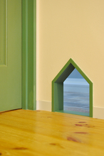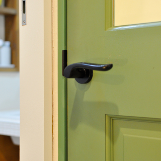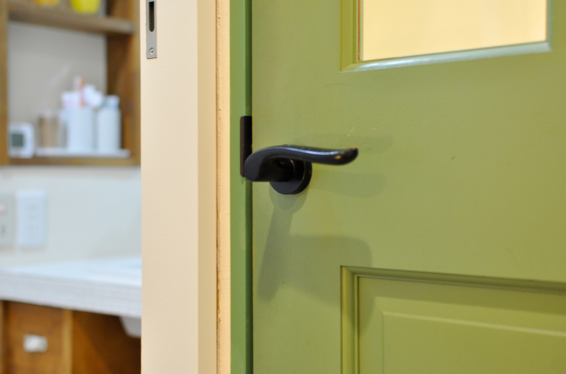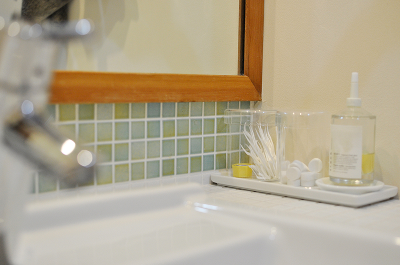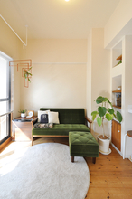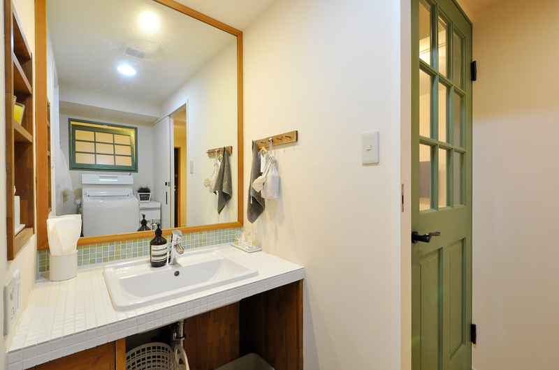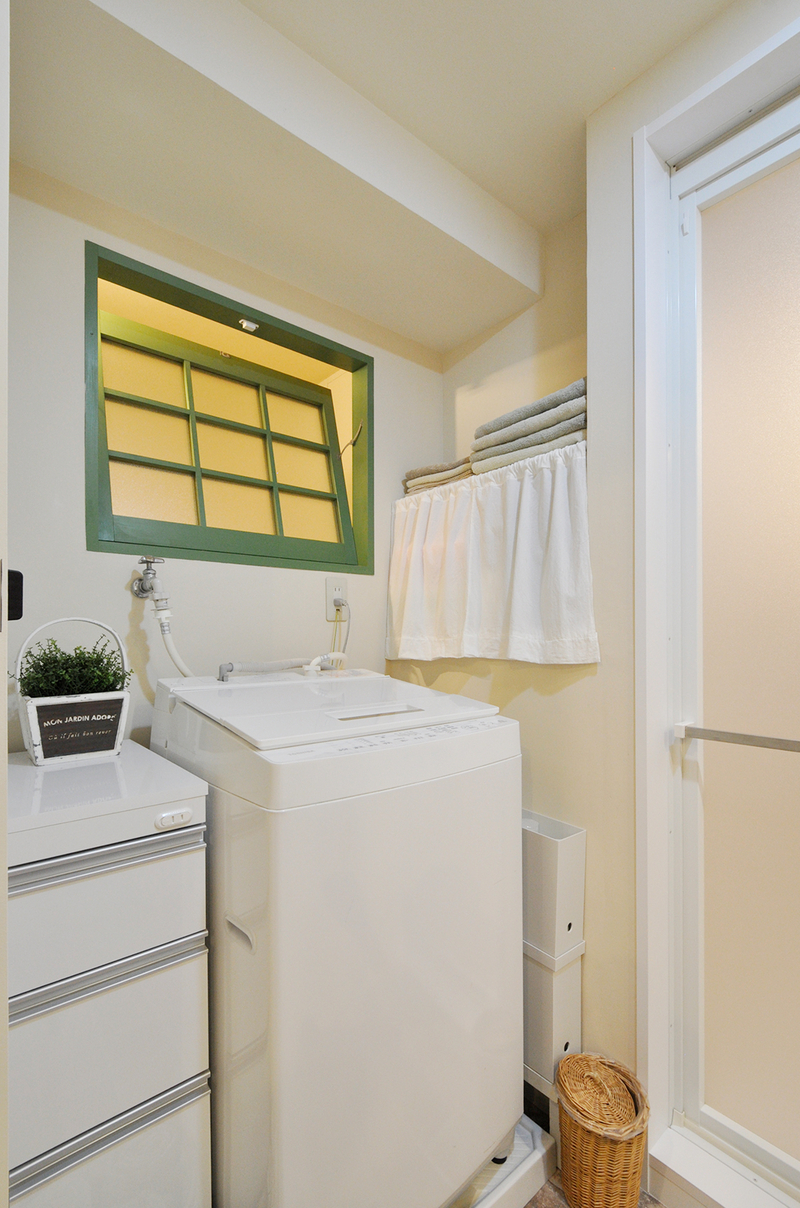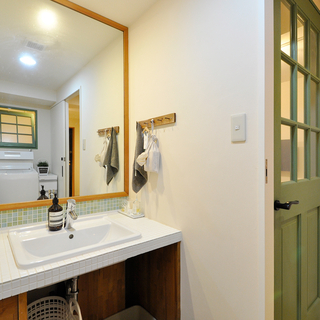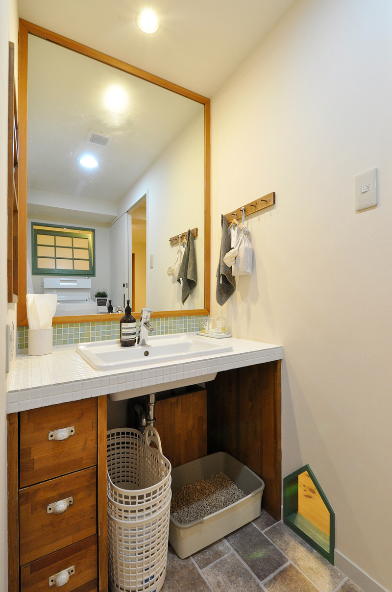 洗面室は、これまで大切に使われてきた造作の洗面台をそのまま活かしながら、暮らしに合わせた工夫をプラスしました。猫ちゃんのトイレスペースとして使っていることから、壁にはリビングドアと色味を合わせたグリーンの“おうち型”開口を造作。やさしいアクセントになり、空間全体の統一感も高まっています。 洗濯機側に移設した内倒し窓も同じグリーンで揃え、細部までデザインを統一。洗面室の入口やユニットバスの入口はホワイトでまとめ、床のフロアタイルも一新しました。使い慣れたものを残しつつ、明るく清潔感のある、家族にも猫ちゃんにも心地よい洗面空間に生まれ変わりました。