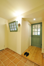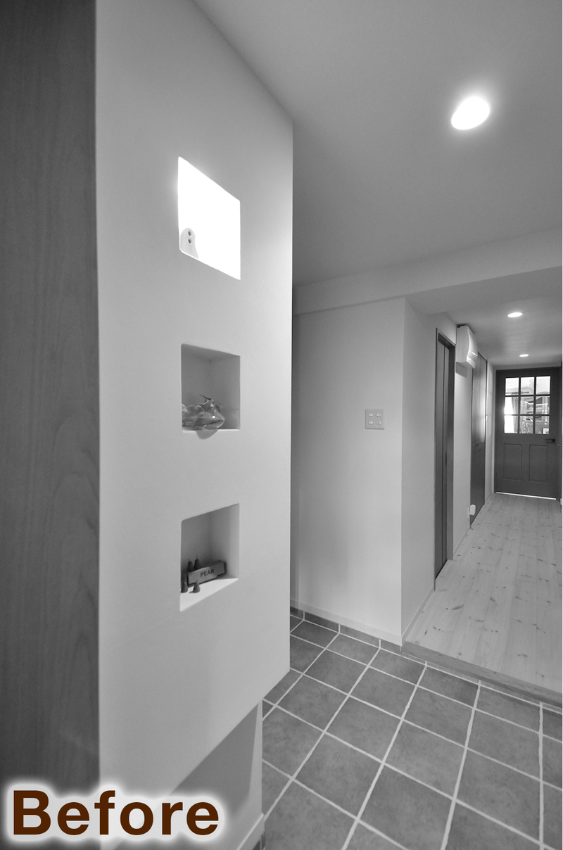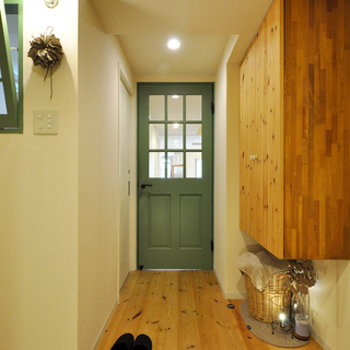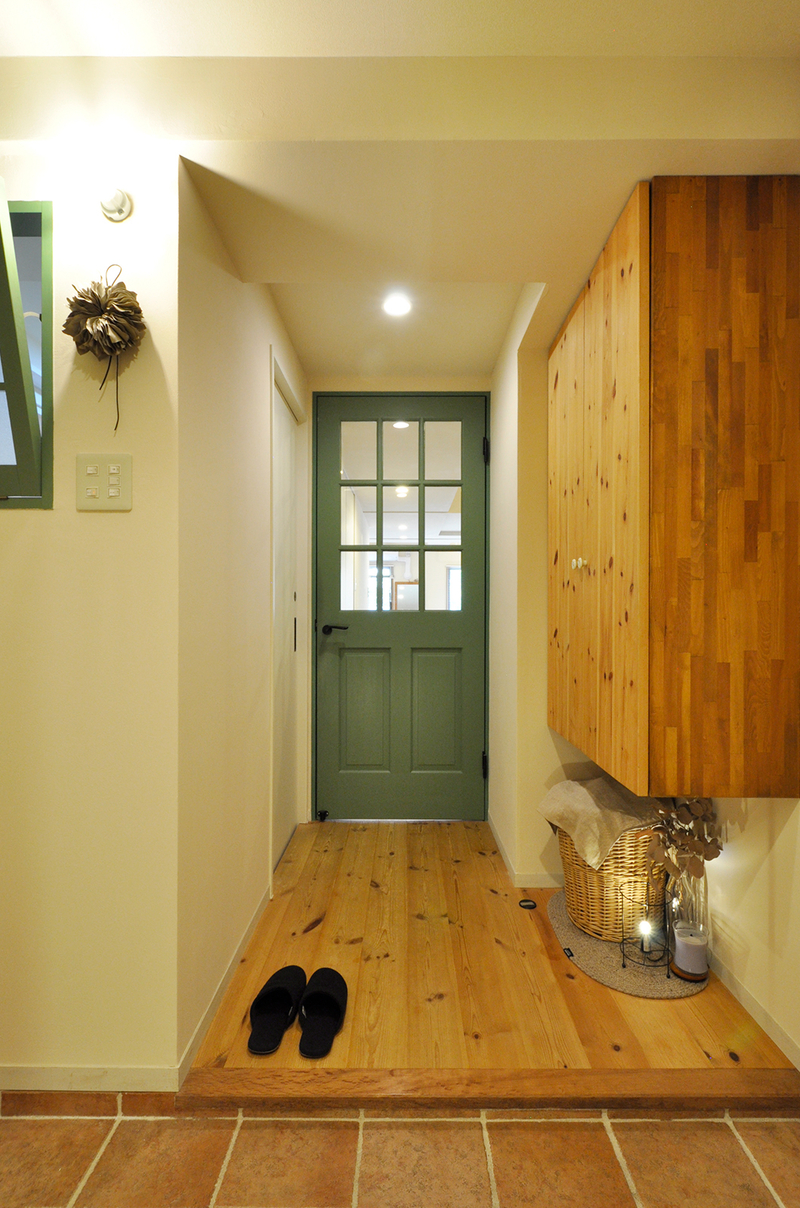 以前キッチン背面収納に設けていた内倒し窓は、今回のリフォームで洗面脱衣室と玄関ホールの間の壁へと移設しました。あわせて、印象的なグリーンのリビングドアも位置を変え、空間全体のつながりを見直しています。内倒し窓の横にはブラケットライトを設け、やわらかな光が玄関ホールを包み込むように。窓と照明、ドアのデザインが並ぶことで、統一感のある心地よいアクセントになりました。機能性だけでなく、眺めるたびに気持ちが和らぐ、住まいの表情づくりにもこだわったリフォームです。