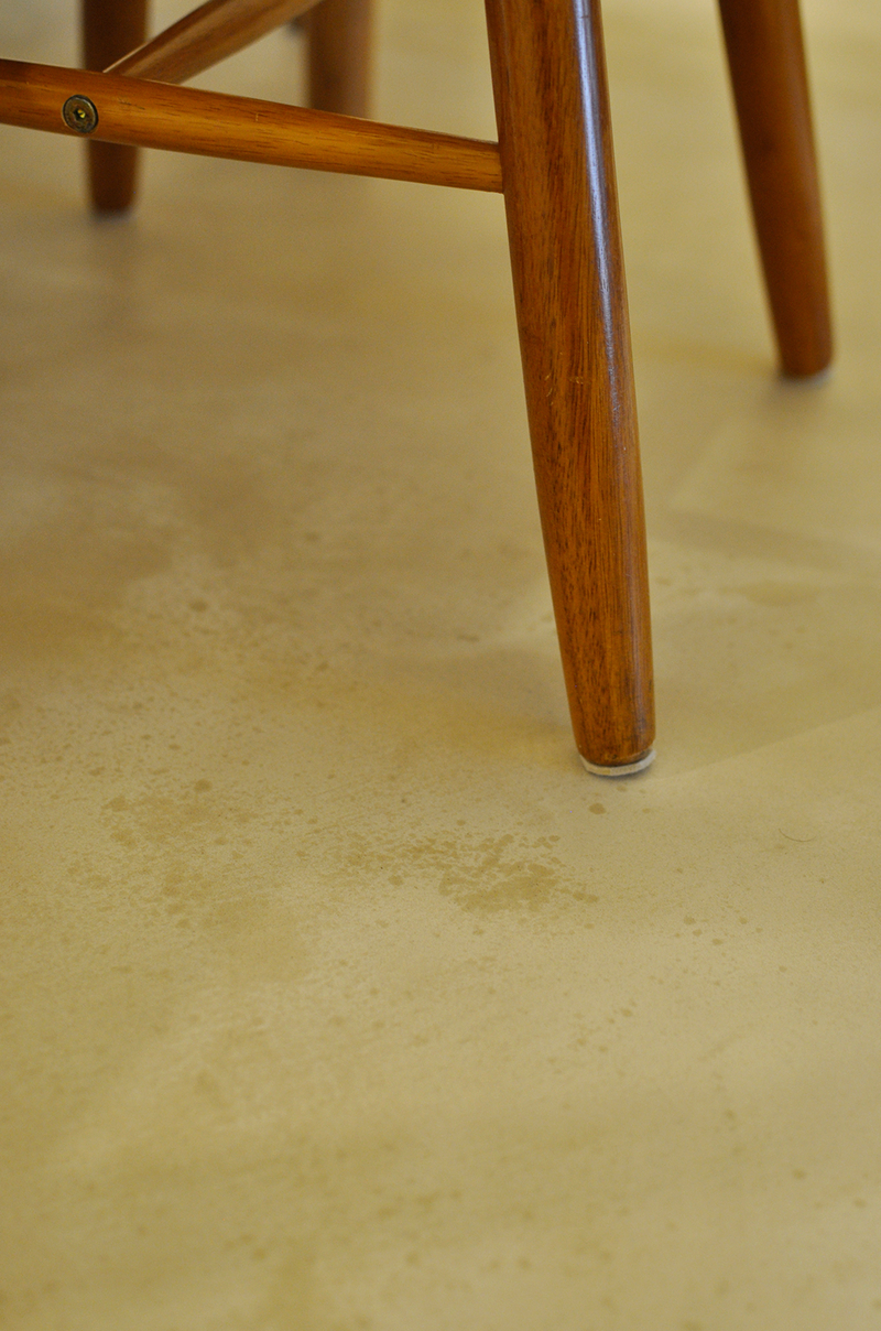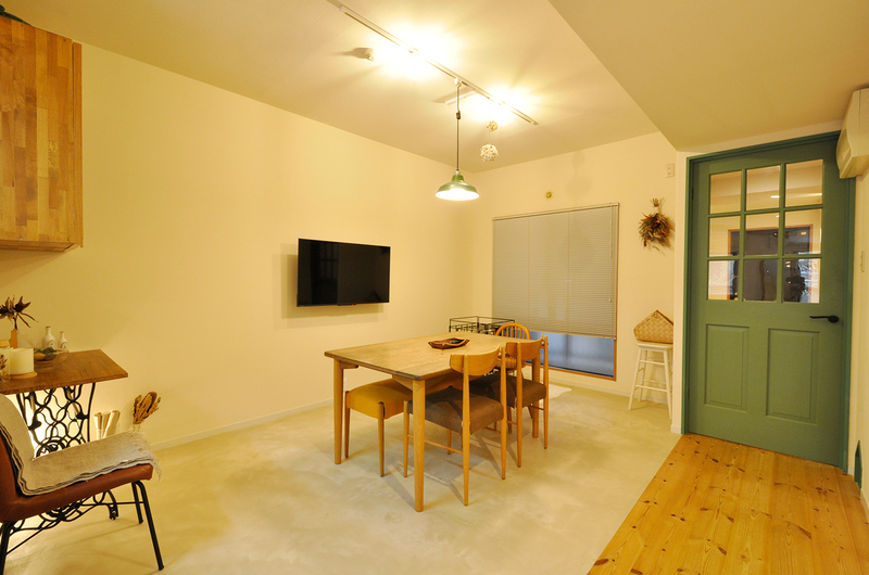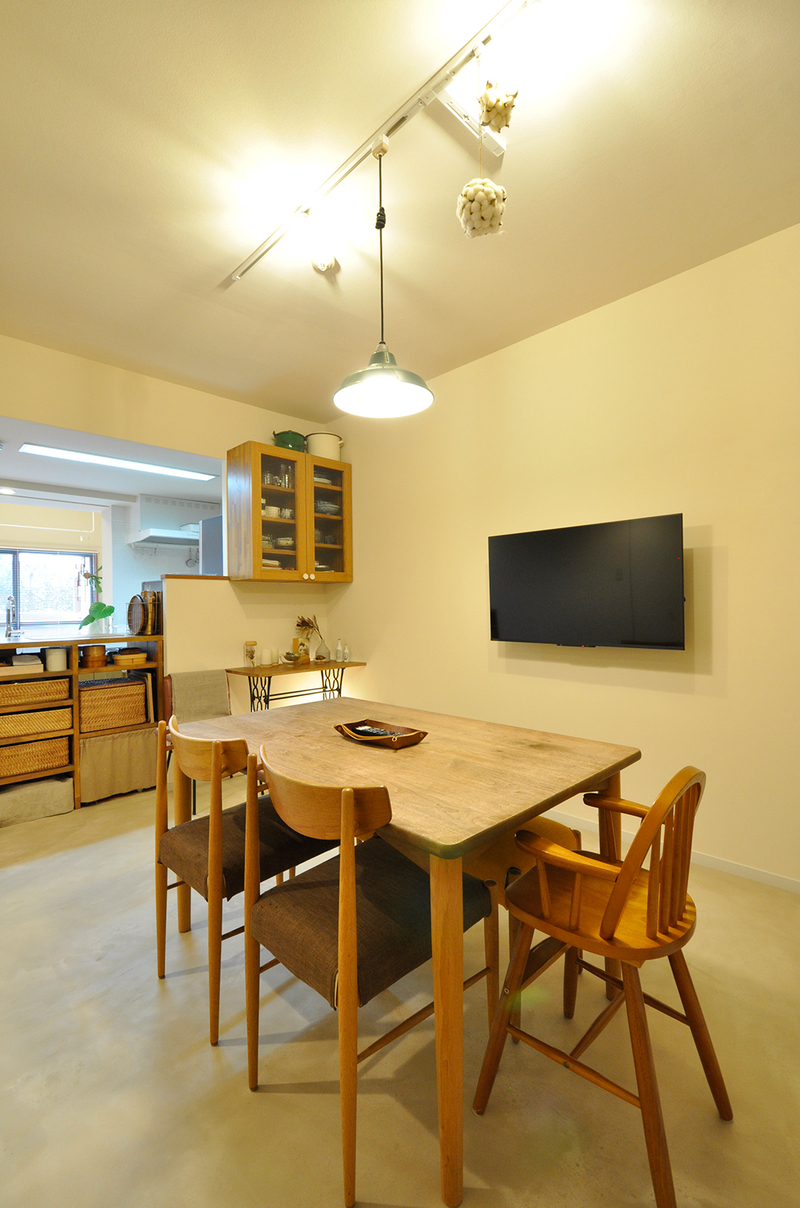以前は寝室として使っていたお部屋を、思い切ってダイニングスペースへとリフォームしました。壁を撤去して廊下とつなげたことで、LDK全体が広がり、家族が自然と集まる開放的な空間に。床にはモルタル調の左官仕上げ「モールテックス」を採用し、防水性・耐久性に優れながら、濃淡やコテ跡が味わい深い上質な仕上がりになっています。さらに、以前の工事で造作したグリーンのリビングドアや、キッチンで使っていた吊り戸棚は、アクリル扉に変更してダイニング側へ再利用。これまでの思い出を活かしながら、新しい暮らしに心地よくなじむダイニングが完成しました。